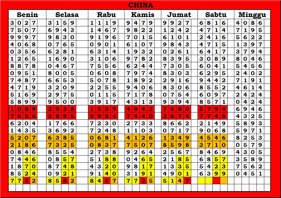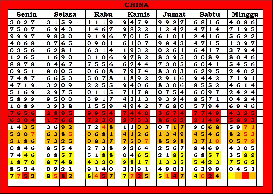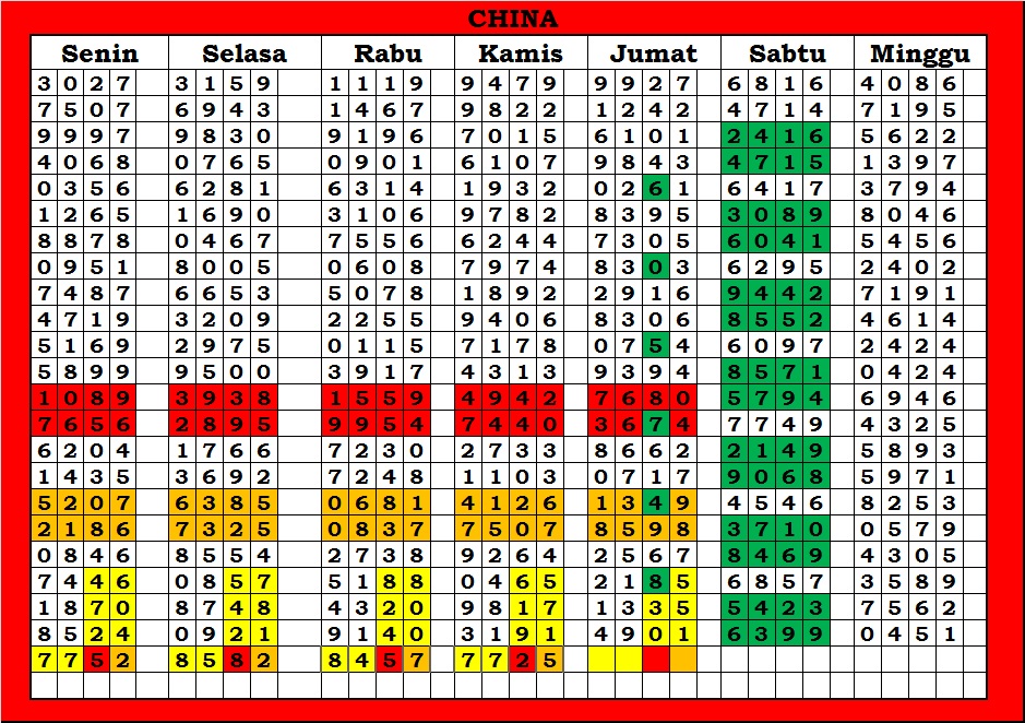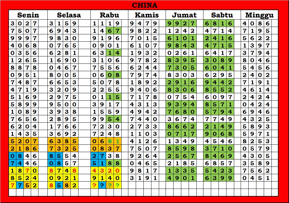 MASTER CHINAPOOLS Kamis, 02-10-2025 Merupakan Prediksi Otomatis yang menggabungkan Metode Kalender Togel Dengan Rumus-rumus kontrol yang sudah terbukti keakuratanya.Gunakan Aplikasi Rekap untuk mendapatkan LN TOP. Harap Maklum Jika kadang meleset MASTER CHINAPOOLS kita. Jadikan ini sebagai perbandingan saja dan tetap UPS