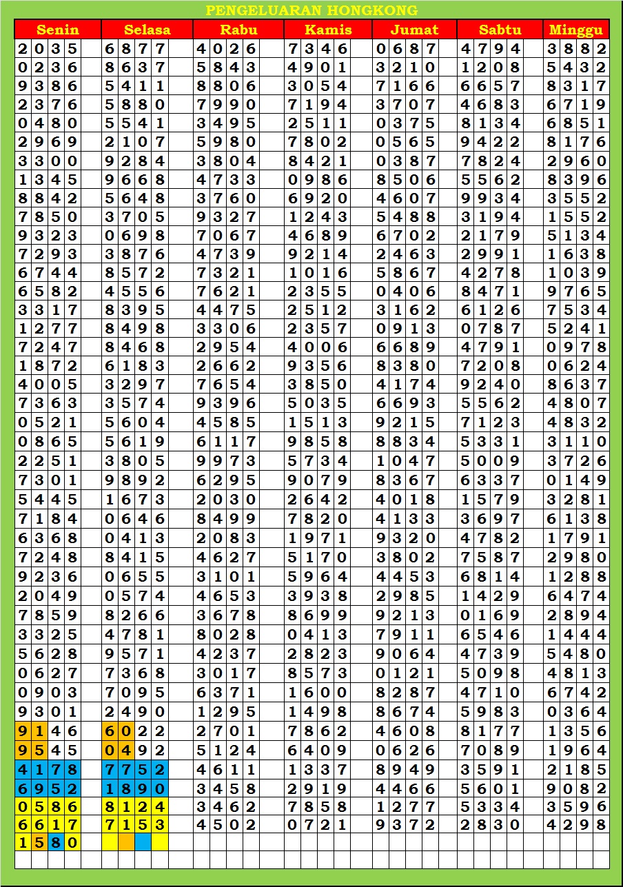 MASTER HONGKONG Sabtu, 11-10-2025 Merupakan Prediksi Otomatis yang menggabungkan Metode Kalender Togel Dengan Rumus-rumus kontrol yang sudah terbukti keakuratanya.Gunakan Aplikasi Rekap untuk mendapatkan LN TOP. Harap Maklum Jika kadang meleset MASTER HONGKONG kita. Jadikan ini sebagai perbandingan saja dan tetap UPS