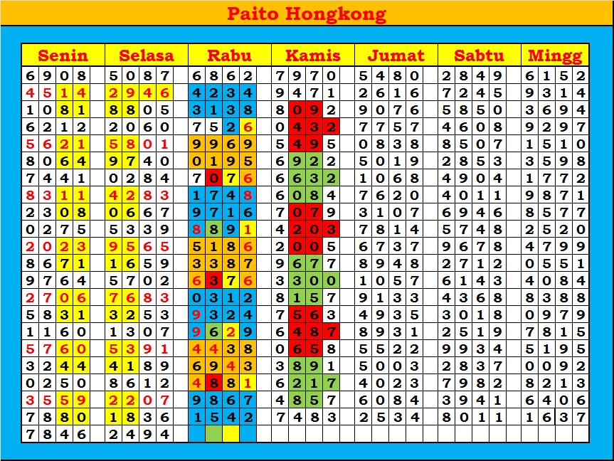 MASTER HONGKONG Sabtu, 04-10-2025 Merupakan Prediksi Otomatis yang menggabungkan Metode Kalender Togel Dengan Rumus-rumus kontrol yang sudah terbukti keakuratanya.Gunakan Aplikasi Rekap untuk mendapatkan LN TOP. Harap Maklum Jika kadang meleset MASTER HONGKONG kita. Jadikan ini sebagai perbandingan saja dan tetap UPS