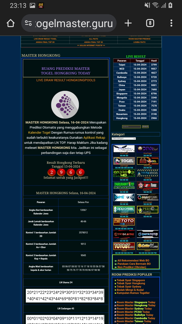 MASTER HONGKONG Sabtu, 04-10-2025 Merupakan Prediksi Otomatis yang menggabungkan Metode Kalender Togel Dengan Rumus-rumus kontrol yang sudah terbukti keakuratanya.Gunakan Aplikasi Rekap untuk mendapatkan LN TOP. Harap Maklum Jika kadang meleset MASTER HONGKONG kita. Jadikan ini sebagai perbandingan saja dan tetap UPS
