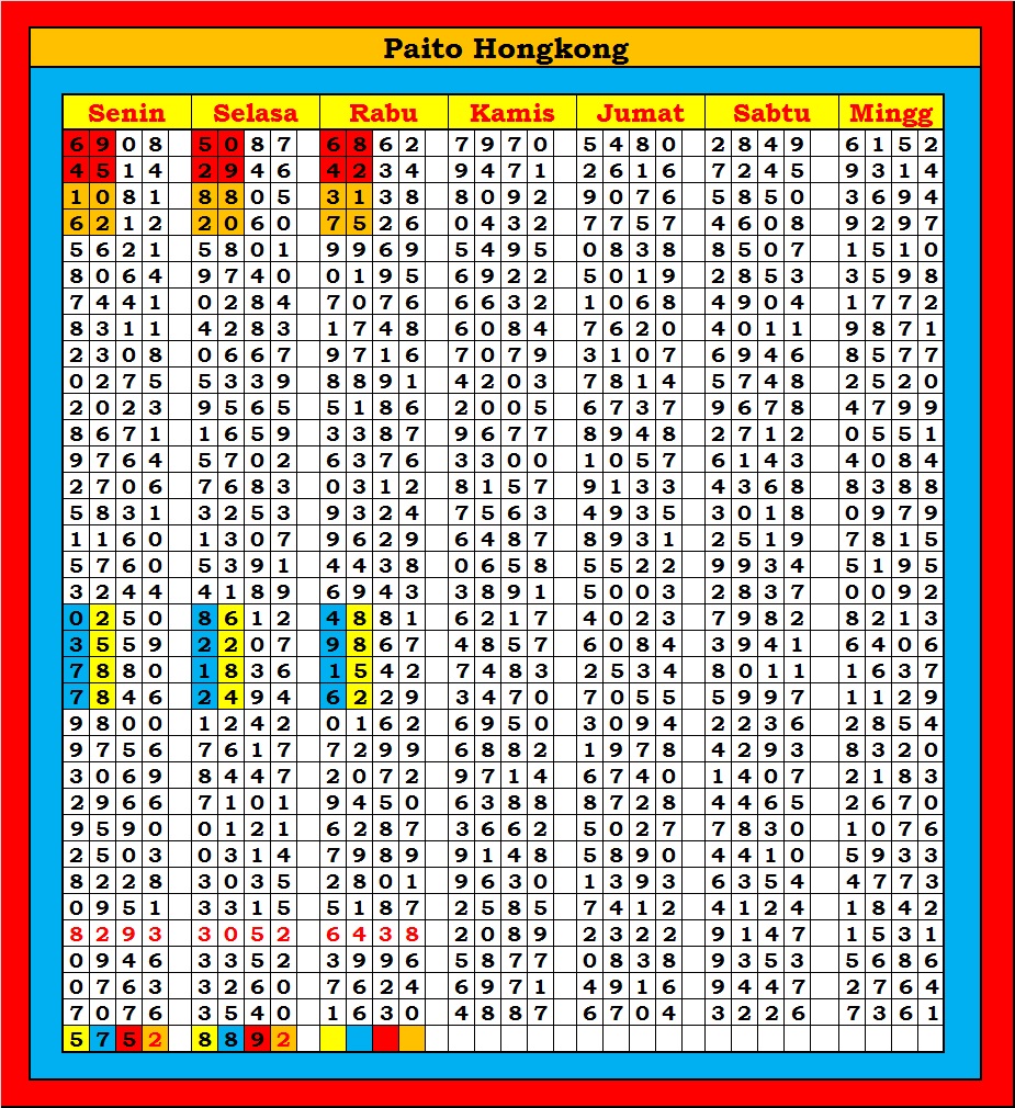 MASTER HONGKONG Sabtu, 04-10-2025 Merupakan Prediksi Otomatis yang menggabungkan Metode Kalender Togel Dengan Rumus-rumus kontrol yang sudah terbukti keakuratanya.Gunakan Aplikasi Rekap untuk mendapatkan LN TOP. Harap Maklum Jika kadang meleset MASTER HONGKONG kita. Jadikan ini sebagai perbandingan saja dan tetap UPS