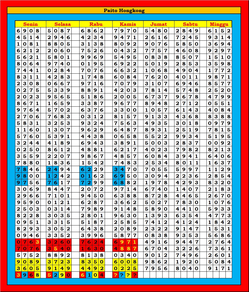 MASTER HONGKONG Sabtu, 04-10-2025 Merupakan Prediksi Otomatis yang menggabungkan Metode Kalender Togel Dengan Rumus-rumus kontrol yang sudah terbukti keakuratanya.Gunakan Aplikasi Rekap untuk mendapatkan LN TOP. Harap Maklum Jika kadang meleset MASTER HONGKONG kita. Jadikan ini sebagai perbandingan saja dan tetap UPS