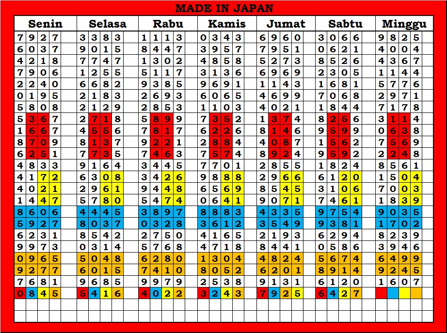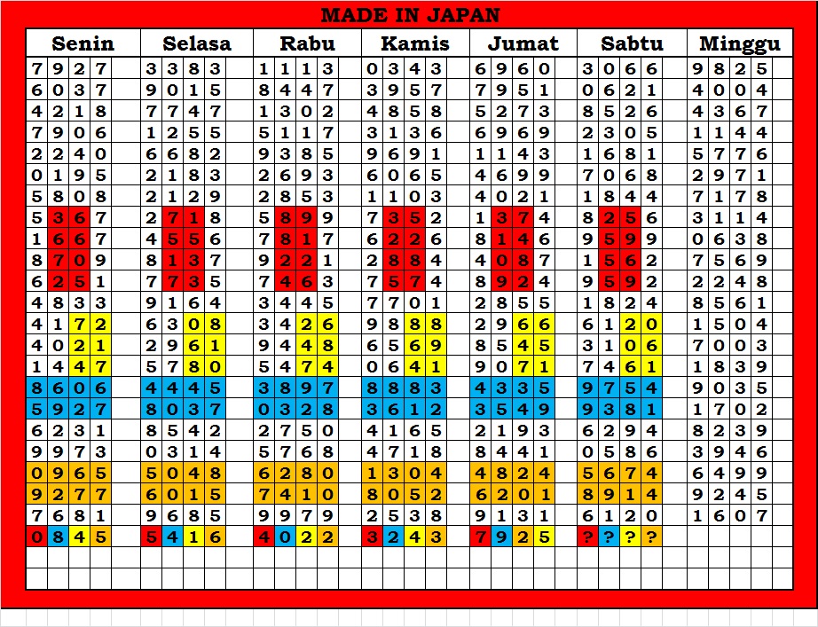 MASTER JAPAN Sabtu, 27-09-2025 Merupakan Prediksi Otomatis yang menggabungkan Metode Kalender Togel Dengan Rumus-rumus kontrol yang sudah terbukti keakuratanya.Gunakan Aplikasi Rekap untuk mendapatkan LN TOP. Harap Maklum Jika kadang meleset MASTER JAPAN kita. Jadikan ini sebagai perbandingan saja dan tetap UPS