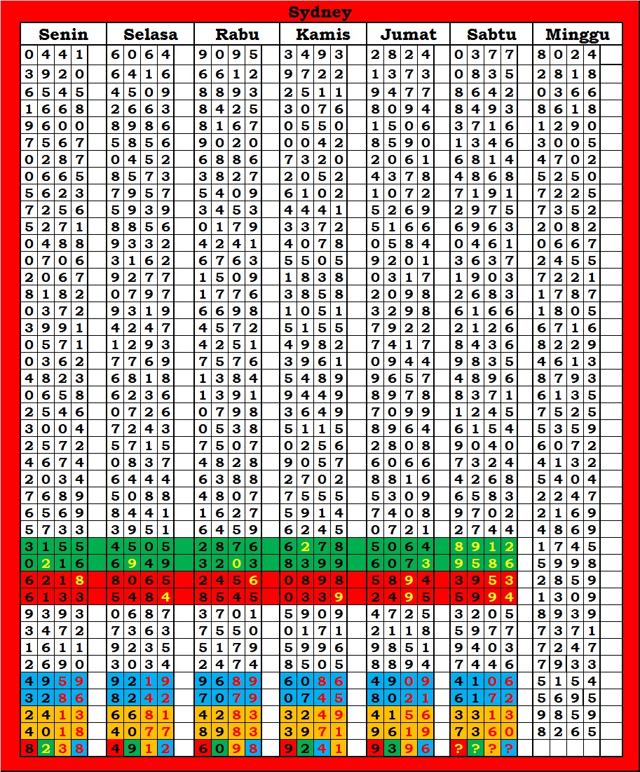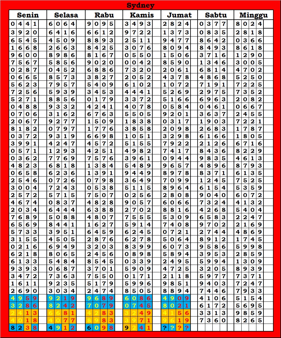 MASTER SYDNEY Jumat, 10-10-2025 Merupakan Prediksi Otomatis yang menggabungkan Metode Kalender Togel Dengan Rumus-rumus kontrol yang sudah terbukti keakuratanya.Gunakan Aplikasi Rekap untuk mendapatkan LN TOP. Harap Maklum Jika kadang meleset MASTER SYDNEY kita. Jadikan ini sebagai perbandingan saja dan tetap UPS