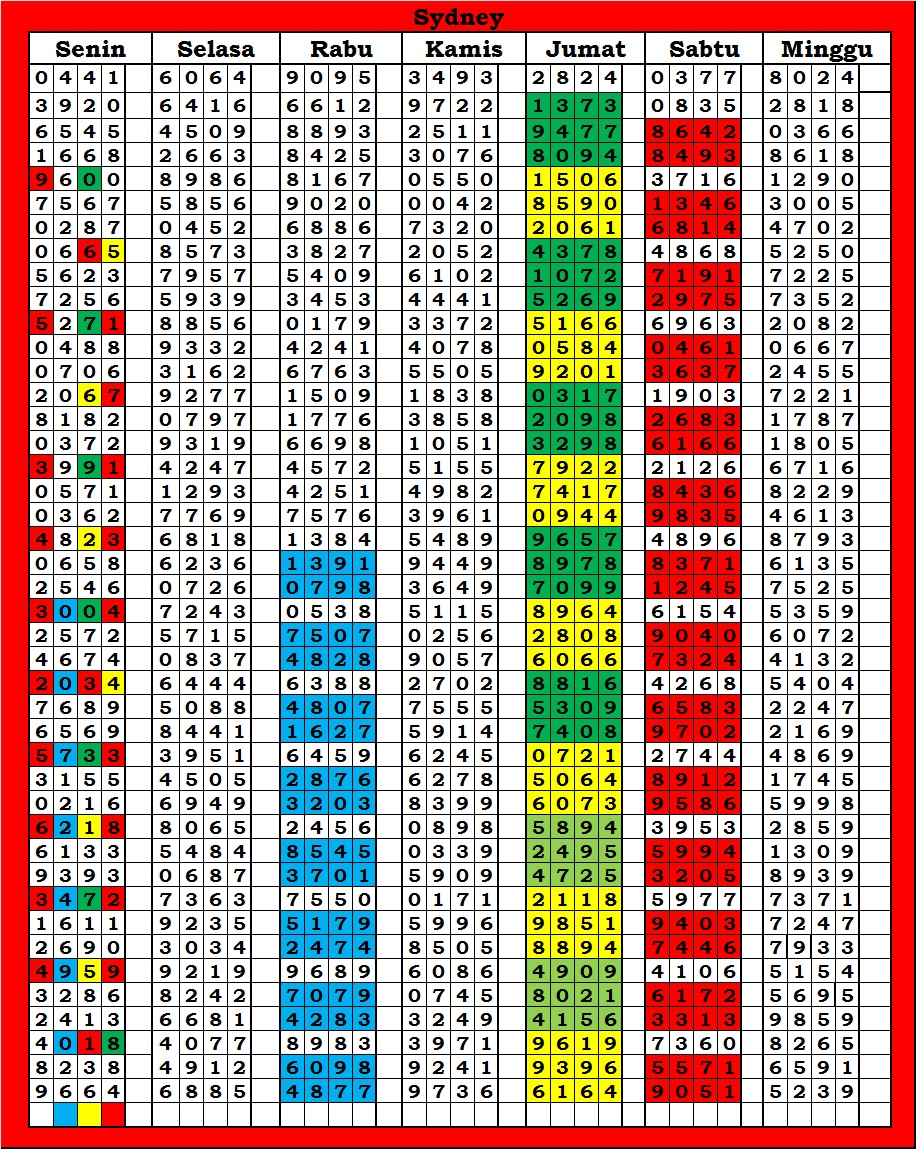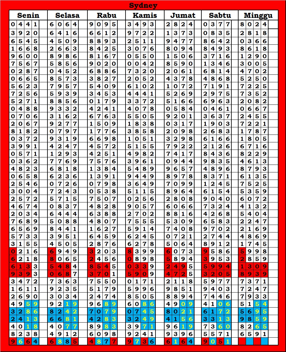 MASTER SYDNEY Jumat, 10-10-2025 Merupakan Prediksi Otomatis yang menggabungkan Metode Kalender Togel Dengan Rumus-rumus kontrol yang sudah terbukti keakuratanya.Gunakan Aplikasi Rekap untuk mendapatkan LN TOP. Harap Maklum Jika kadang meleset MASTER SYDNEY kita. Jadikan ini sebagai perbandingan saja dan tetap UPS