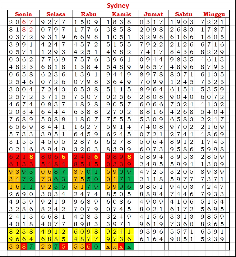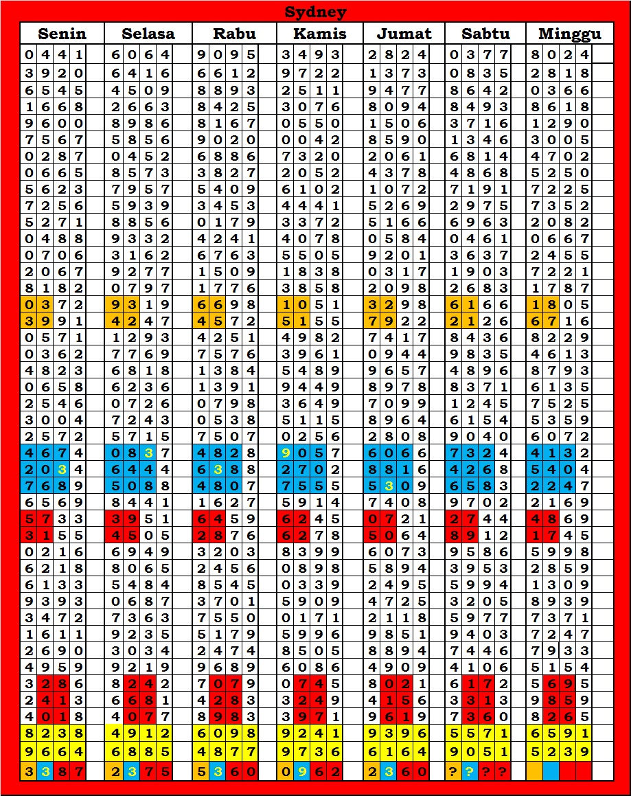 MASTER SYDNEY Jumat, 10-10-2025 Merupakan Prediksi Otomatis yang menggabungkan Metode Kalender Togel Dengan Rumus-rumus kontrol yang sudah terbukti keakuratanya.Gunakan Aplikasi Rekap untuk mendapatkan LN TOP. Harap Maklum Jika kadang meleset MASTER SYDNEY kita. Jadikan ini sebagai perbandingan saja dan tetap UPS