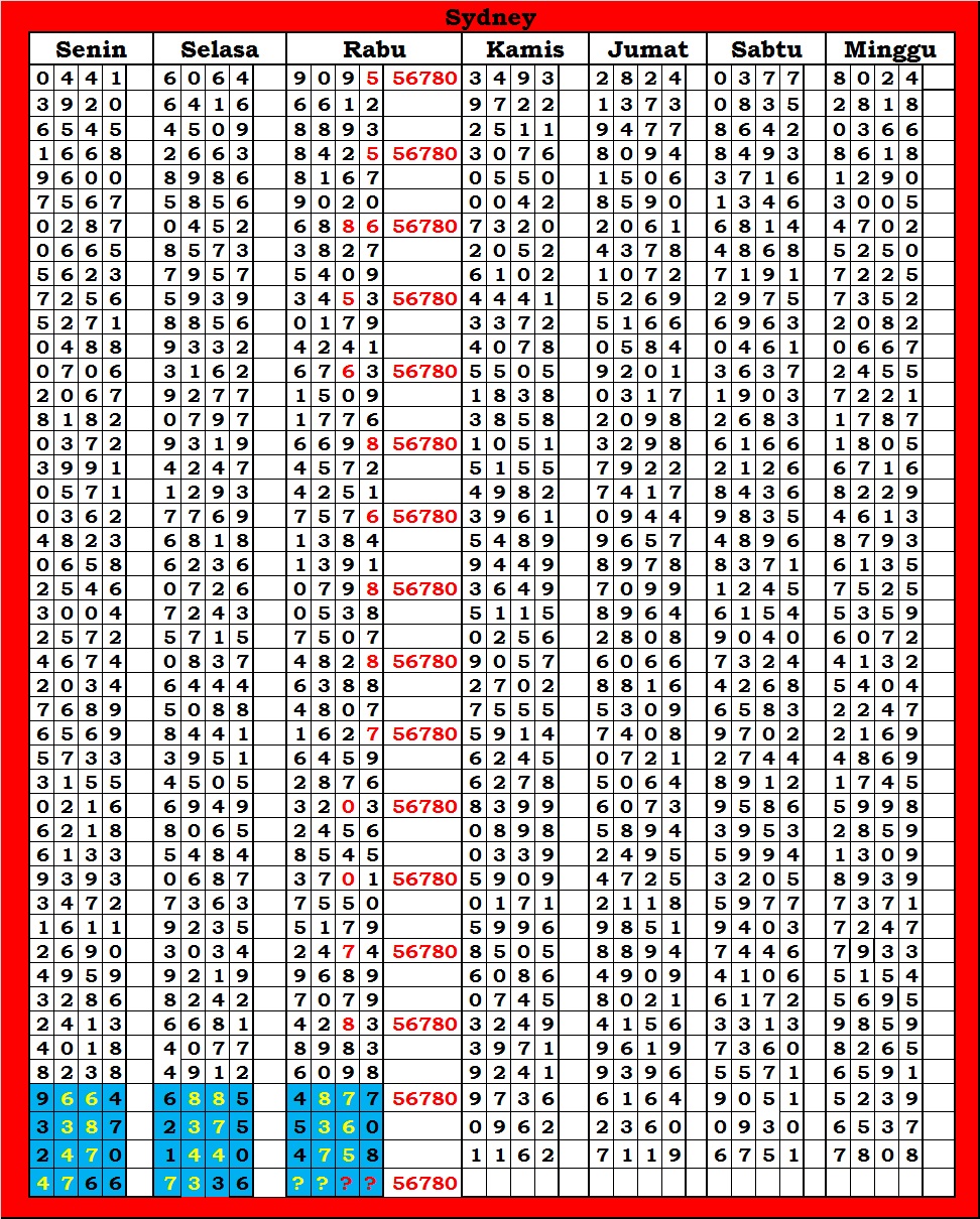 MASTER SYDNEY Kamis, 09-10-2025 Merupakan Prediksi Otomatis yang menggabungkan Metode Kalender Togel Dengan Rumus-rumus kontrol yang sudah terbukti keakuratanya.Gunakan Aplikasi Rekap untuk mendapatkan LN TOP. Harap Maklum Jika kadang meleset MASTER SYDNEY kita. Jadikan ini sebagai perbandingan saja dan tetap UPS