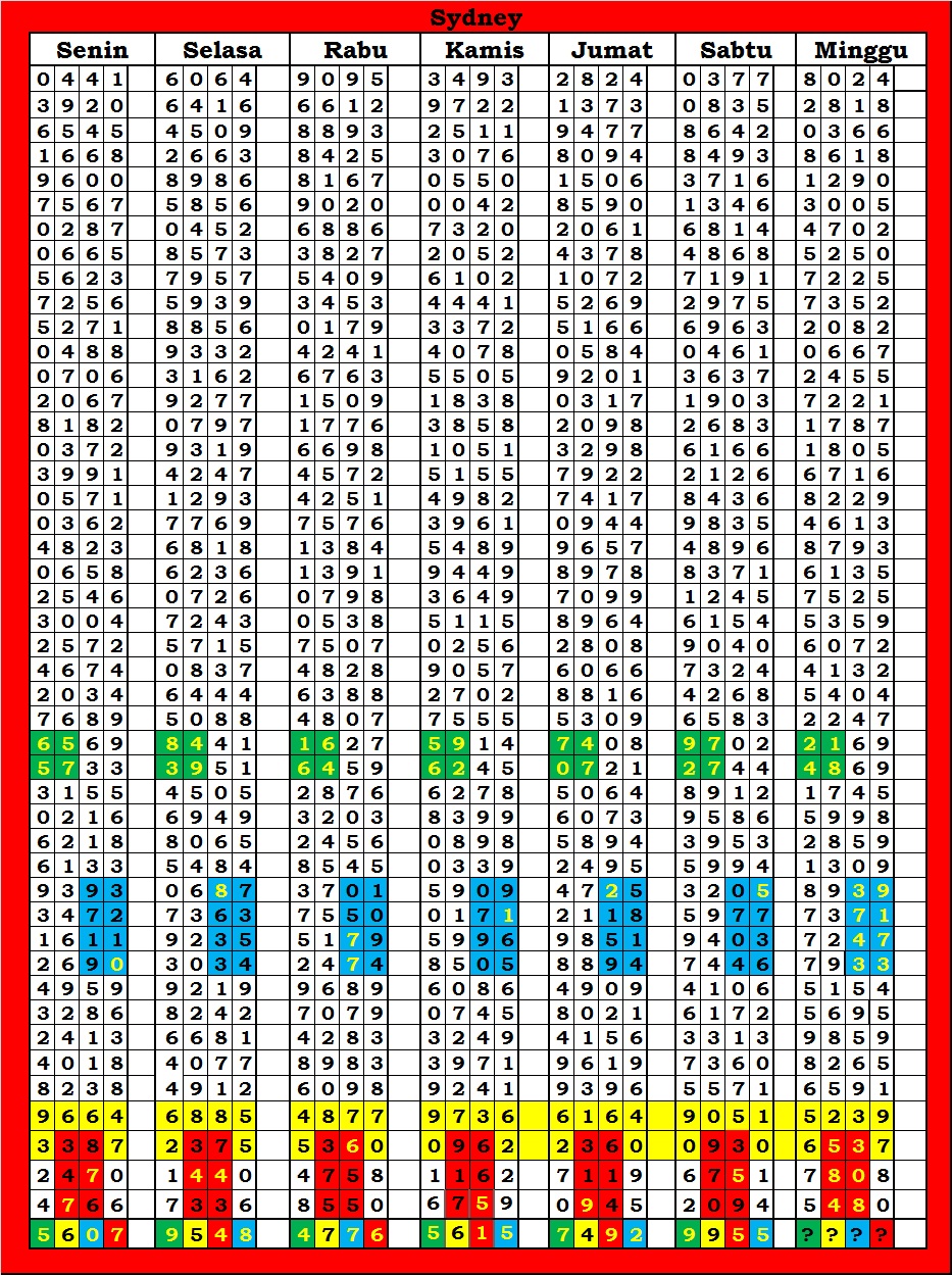 MASTER SYDNEY Kamis, 09-10-2025 Merupakan Prediksi Otomatis yang menggabungkan Metode Kalender Togel Dengan Rumus-rumus kontrol yang sudah terbukti keakuratanya.Gunakan Aplikasi Rekap untuk mendapatkan LN TOP. Harap Maklum Jika kadang meleset MASTER SYDNEY kita. Jadikan ini sebagai perbandingan saja dan tetap UPS
