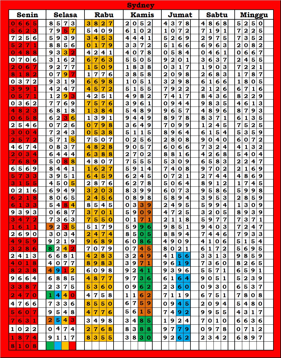 MASTER SYDNEY Kamis, 09-10-2025 Merupakan Prediksi Otomatis yang menggabungkan Metode Kalender Togel Dengan Rumus-rumus kontrol yang sudah terbukti keakuratanya.Gunakan Aplikasi Rekap untuk mendapatkan LN TOP. Harap Maklum Jika kadang meleset MASTER SYDNEY kita. Jadikan ini sebagai perbandingan saja dan tetap UPS