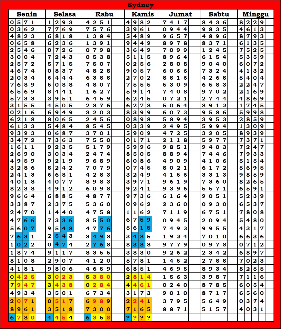 MASTER SYDNEY Selasa, 07-10-2025 Merupakan Prediksi Otomatis yang menggabungkan Metode Kalender Togel Dengan Rumus-rumus kontrol yang sudah terbukti keakuratanya.Gunakan Aplikasi Rekap untuk mendapatkan LN TOP. Harap Maklum Jika kadang meleset MASTER SYDNEY kita. Jadikan ini sebagai perbandingan saja dan tetap UPS