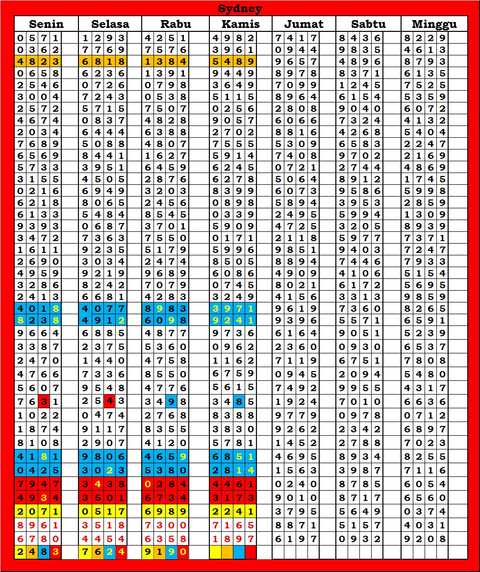 MASTER SYDNEY Selasa, 07-10-2025 Merupakan Prediksi Otomatis yang menggabungkan Metode Kalender Togel Dengan Rumus-rumus kontrol yang sudah terbukti keakuratanya.Gunakan Aplikasi Rekap untuk mendapatkan LN TOP. Harap Maklum Jika kadang meleset MASTER SYDNEY kita. Jadikan ini sebagai perbandingan saja dan tetap UPS