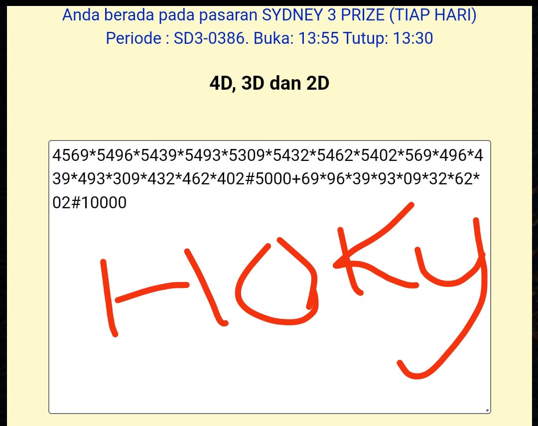 MASTER SYDNEY Minggu, 05-10-2025 Merupakan Prediksi Otomatis yang menggabungkan Metode Kalender Togel Dengan Rumus-rumus kontrol yang sudah terbukti keakuratanya.Gunakan Aplikasi Rekap untuk mendapatkan LN TOP. Harap Maklum Jika kadang meleset MASTER SYDNEY kita. Jadikan ini sebagai perbandingan saja dan tetap UPS