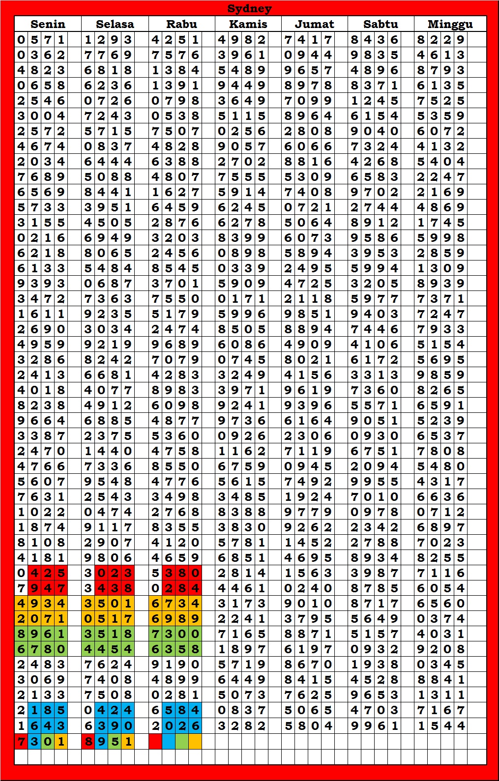 TABEL DATA SYDNEY VERSI 4D TAHUN 2009 HINGGA SEKARANG |