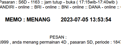 Prediksi Ini Berubah secara otomatis sesuai hari dan result pasaran masing-masing. Untuk melihat prediksi sebelumnya klik tombol nomor hitam diatas