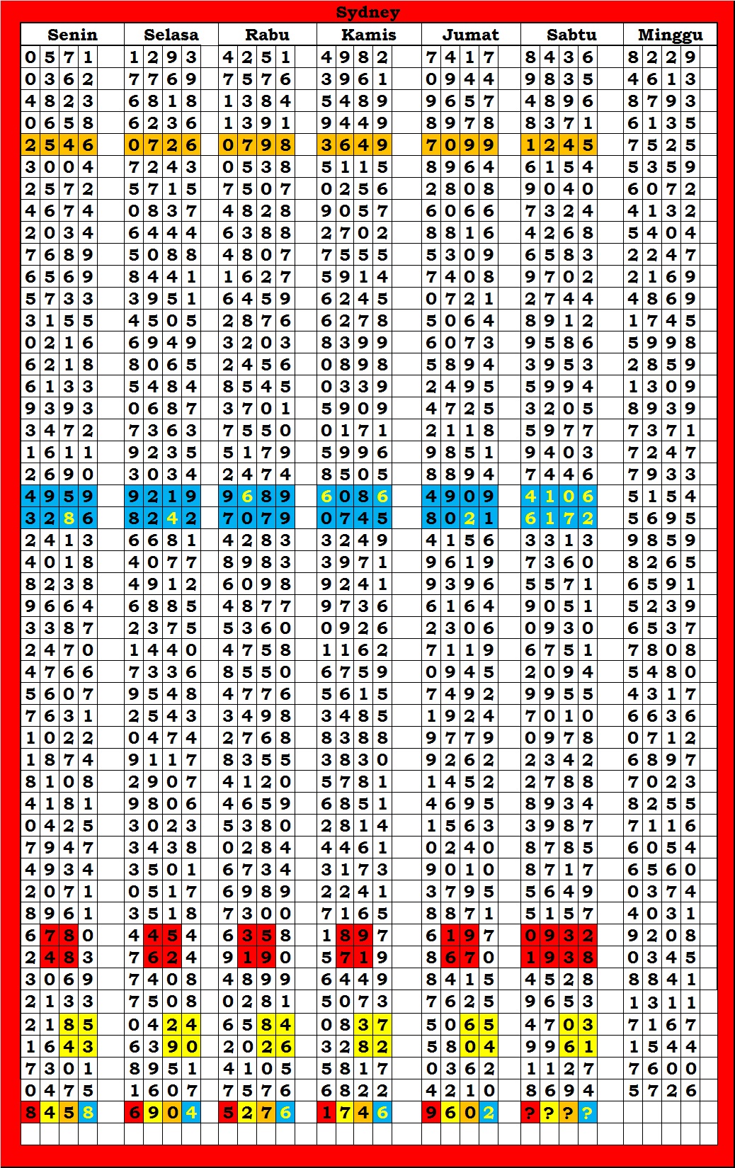 MASTER SYDNEY Minggu, 05-10-2025 Merupakan Prediksi Otomatis yang menggabungkan Metode Kalender Togel Dengan Rumus-rumus kontrol yang sudah terbukti keakuratanya.Gunakan Aplikasi Rekap untuk mendapatkan LN TOP. Harap Maklum Jika kadang meleset MASTER SYDNEY kita. Jadikan ini sebagai perbandingan saja dan tetap UPS