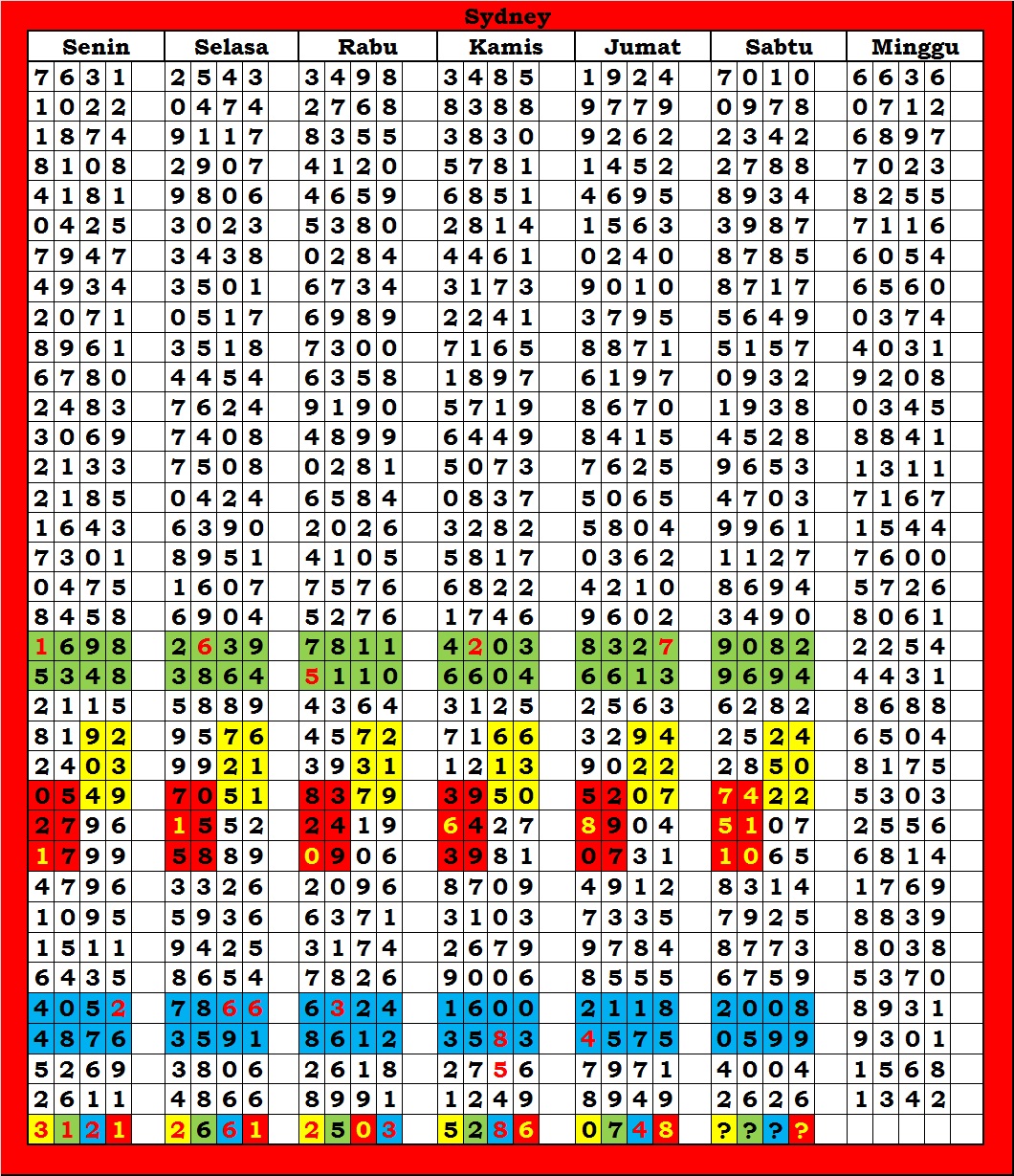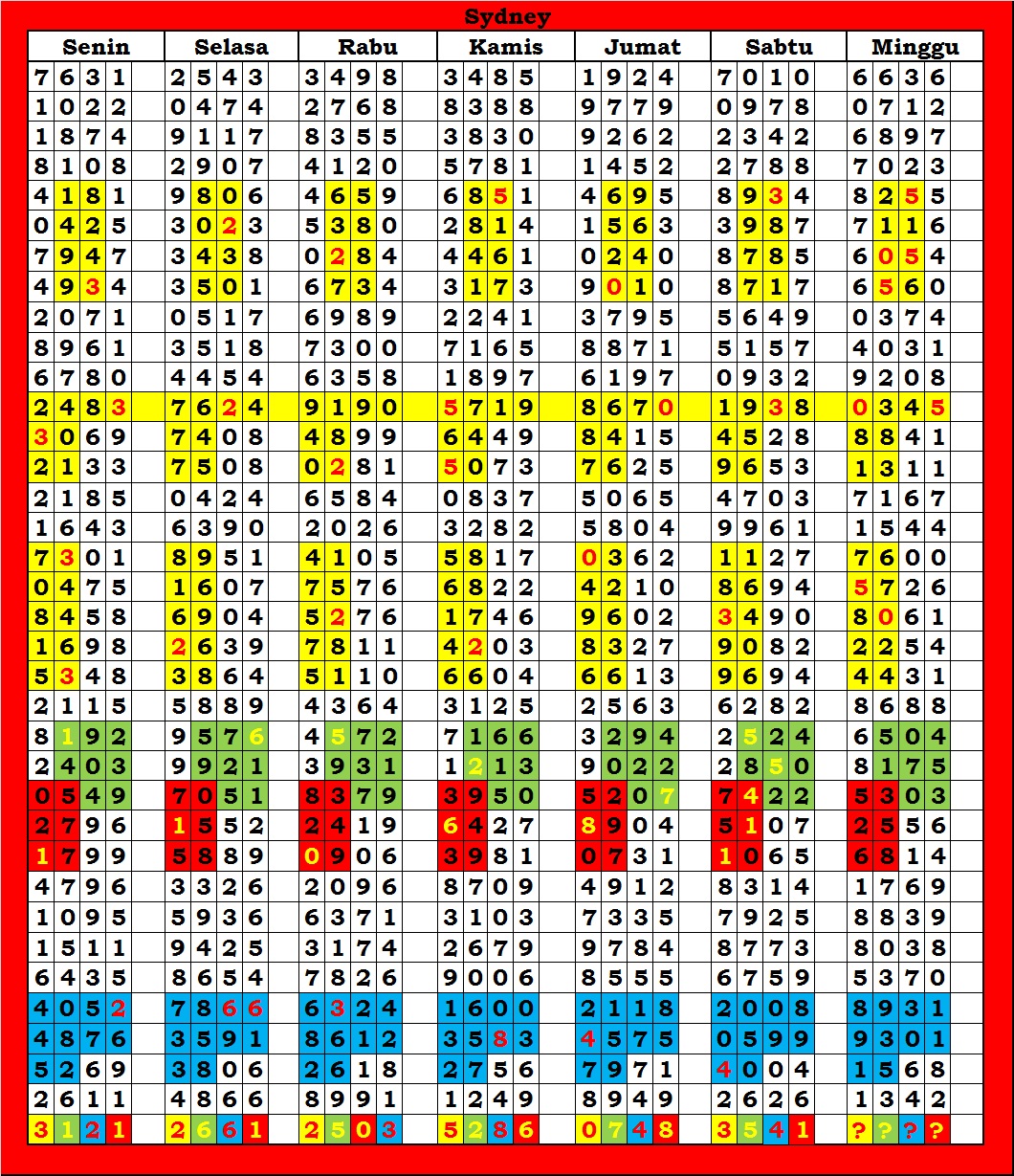 MASTER SYDNEY Sabtu, 04-10-2025 Merupakan Prediksi Otomatis yang menggabungkan Metode Kalender Togel Dengan Rumus-rumus kontrol yang sudah terbukti keakuratanya.Gunakan Aplikasi Rekap untuk mendapatkan LN TOP. Harap Maklum Jika kadang meleset MASTER SYDNEY kita. Jadikan ini sebagai perbandingan saja dan tetap UPS