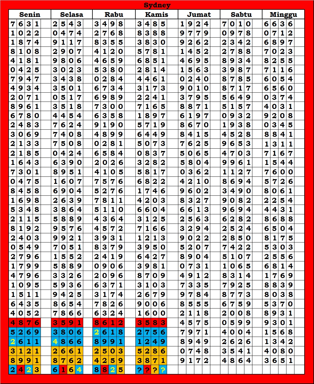 MASTER SYDNEY Sabtu, 04-10-2025 Merupakan Prediksi Otomatis yang menggabungkan Metode Kalender Togel Dengan Rumus-rumus kontrol yang sudah terbukti keakuratanya.Gunakan Aplikasi Rekap untuk mendapatkan LN TOP. Harap Maklum Jika kadang meleset MASTER SYDNEY kita. Jadikan ini sebagai perbandingan saja dan tetap UPS