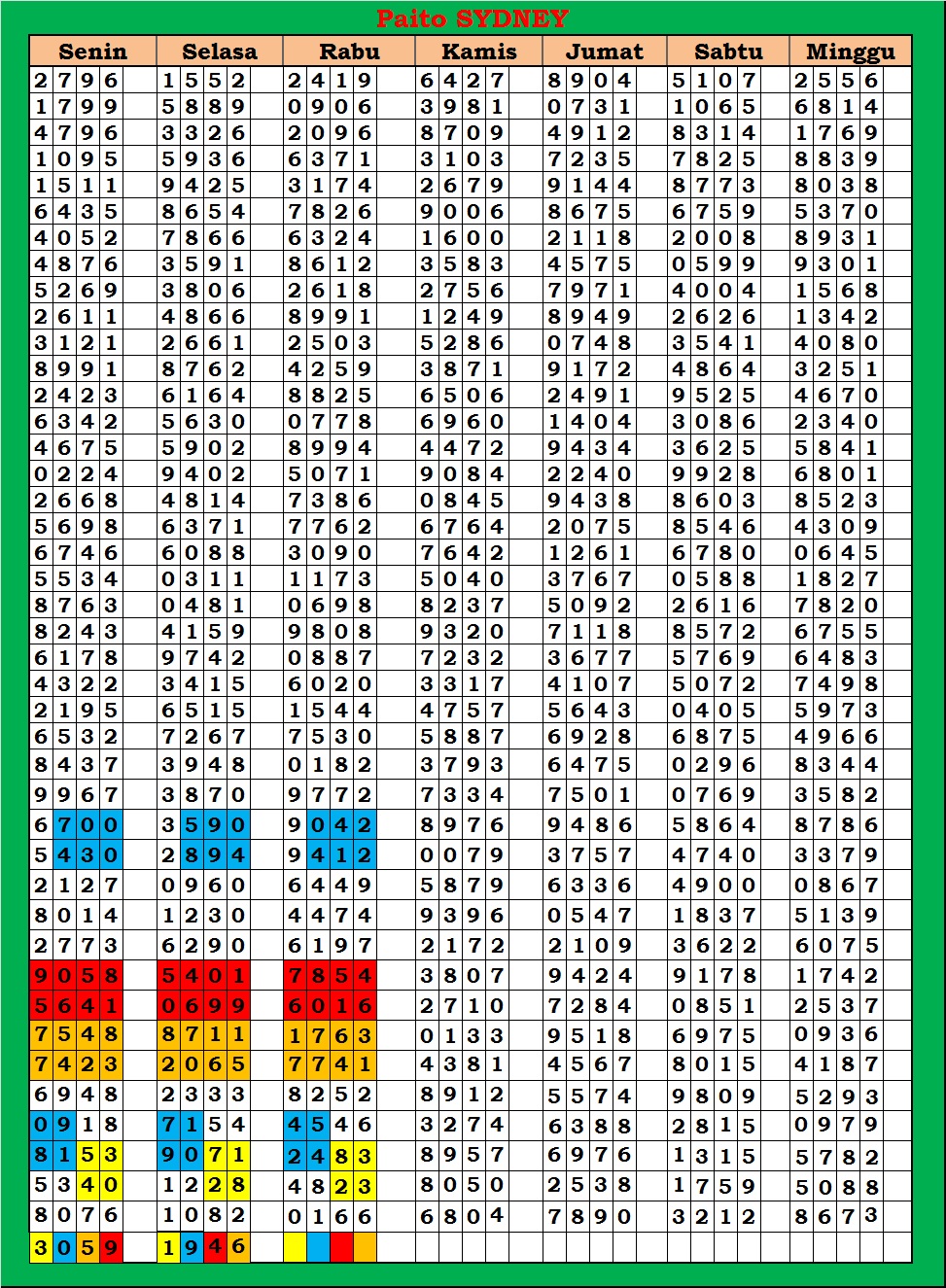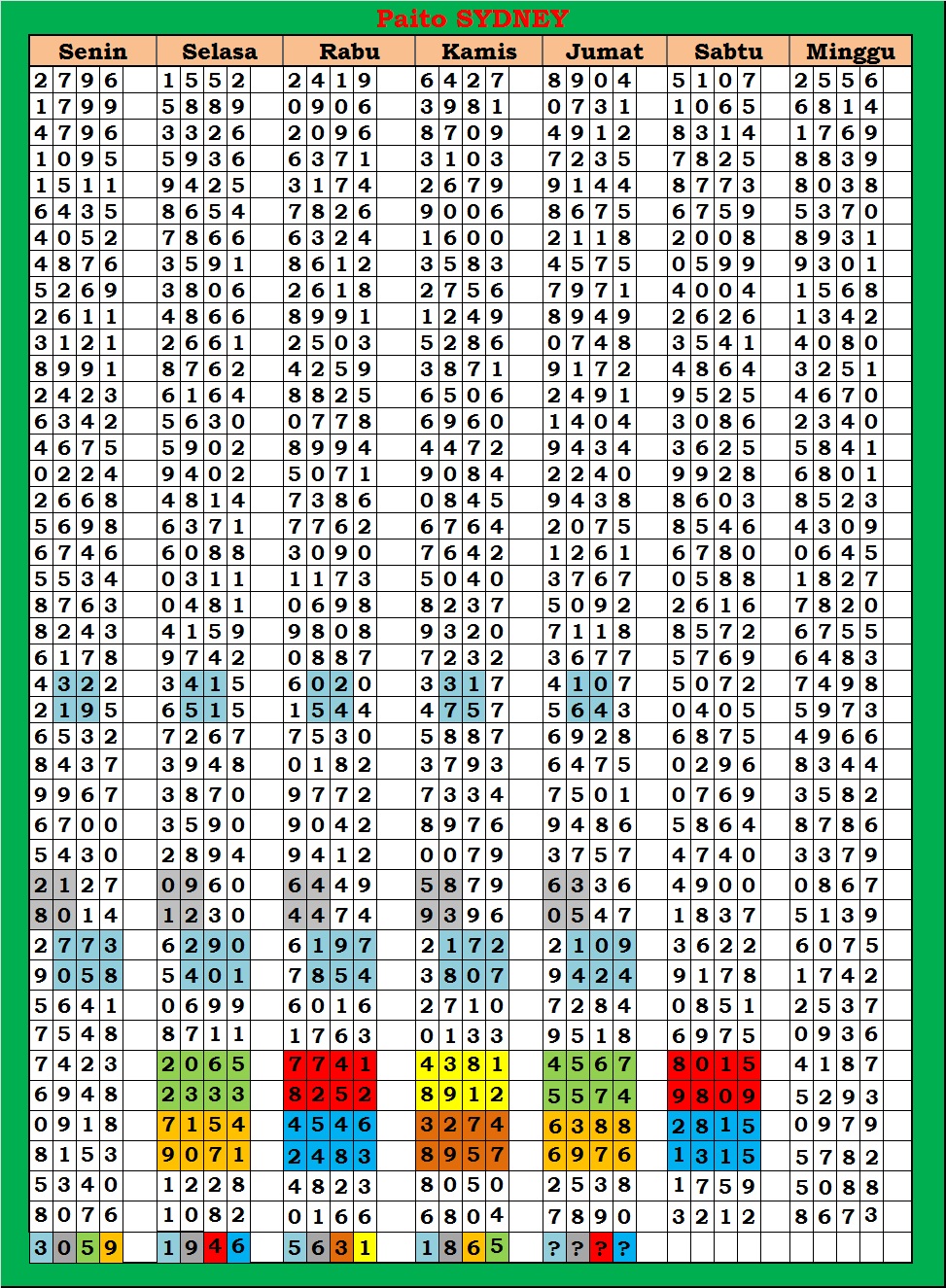 MASTER SYDNEY Jumat, 03-10-2025 Merupakan Prediksi Otomatis yang menggabungkan Metode Kalender Togel Dengan Rumus-rumus kontrol yang sudah terbukti keakuratanya.Gunakan Aplikasi Rekap untuk mendapatkan LN TOP. Harap Maklum Jika kadang meleset MASTER SYDNEY kita. Jadikan ini sebagai perbandingan saja dan tetap UPS