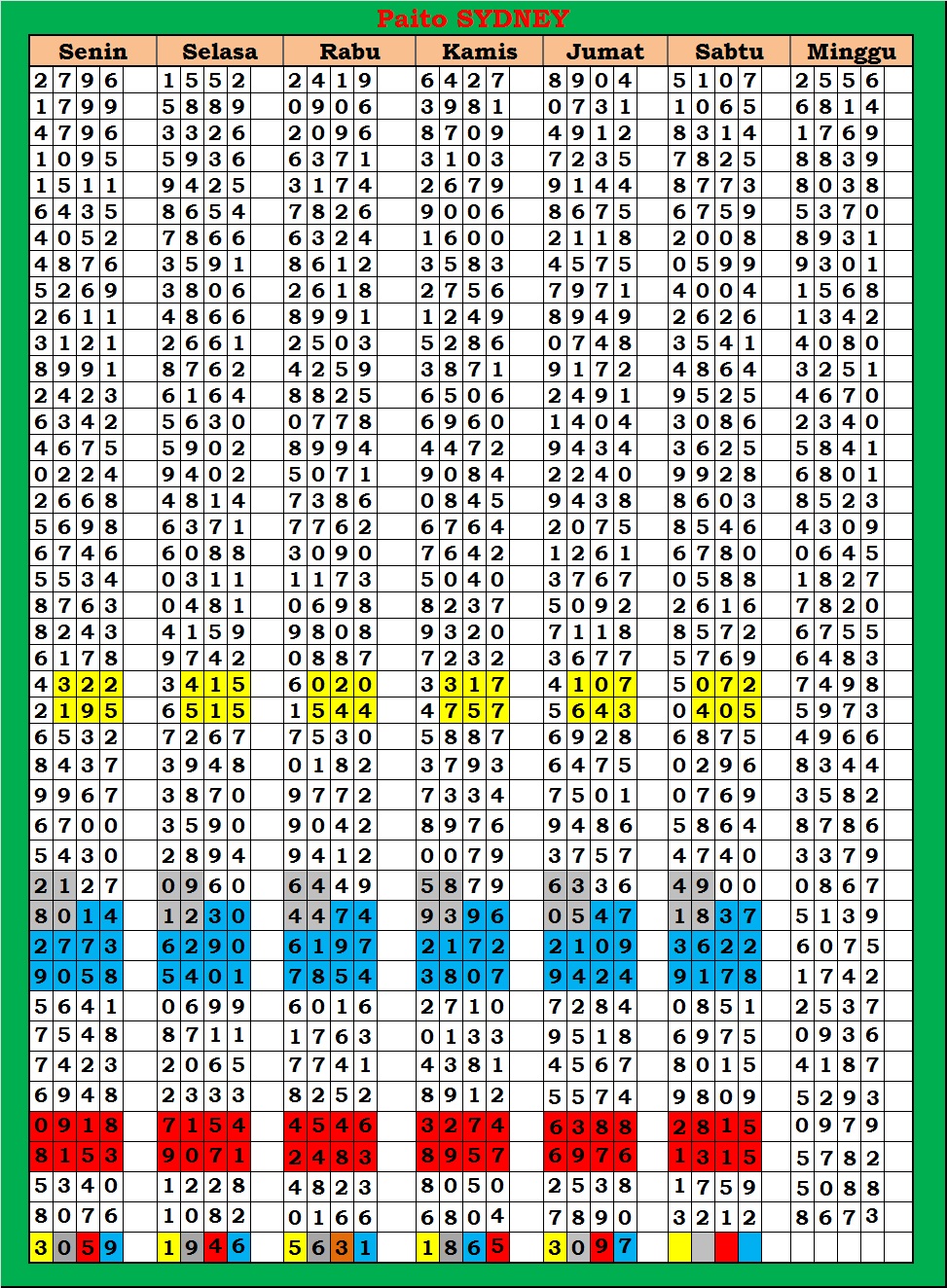 MASTER SYDNEY Jumat, 03-10-2025 Merupakan Prediksi Otomatis yang menggabungkan Metode Kalender Togel Dengan Rumus-rumus kontrol yang sudah terbukti keakuratanya.Gunakan Aplikasi Rekap untuk mendapatkan LN TOP. Harap Maklum Jika kadang meleset MASTER SYDNEY kita. Jadikan ini sebagai perbandingan saja dan tetap UPS