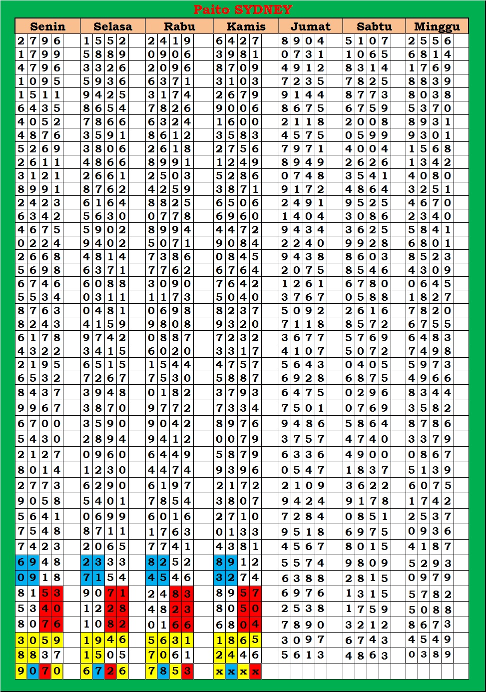MASTER SYDNEY Jumat, 03-10-2025 Merupakan Prediksi Otomatis yang menggabungkan Metode Kalender Togel Dengan Rumus-rumus kontrol yang sudah terbukti keakuratanya.Gunakan Aplikasi Rekap untuk mendapatkan LN TOP. Harap Maklum Jika kadang meleset MASTER SYDNEY kita. Jadikan ini sebagai perbandingan saja dan tetap UPS