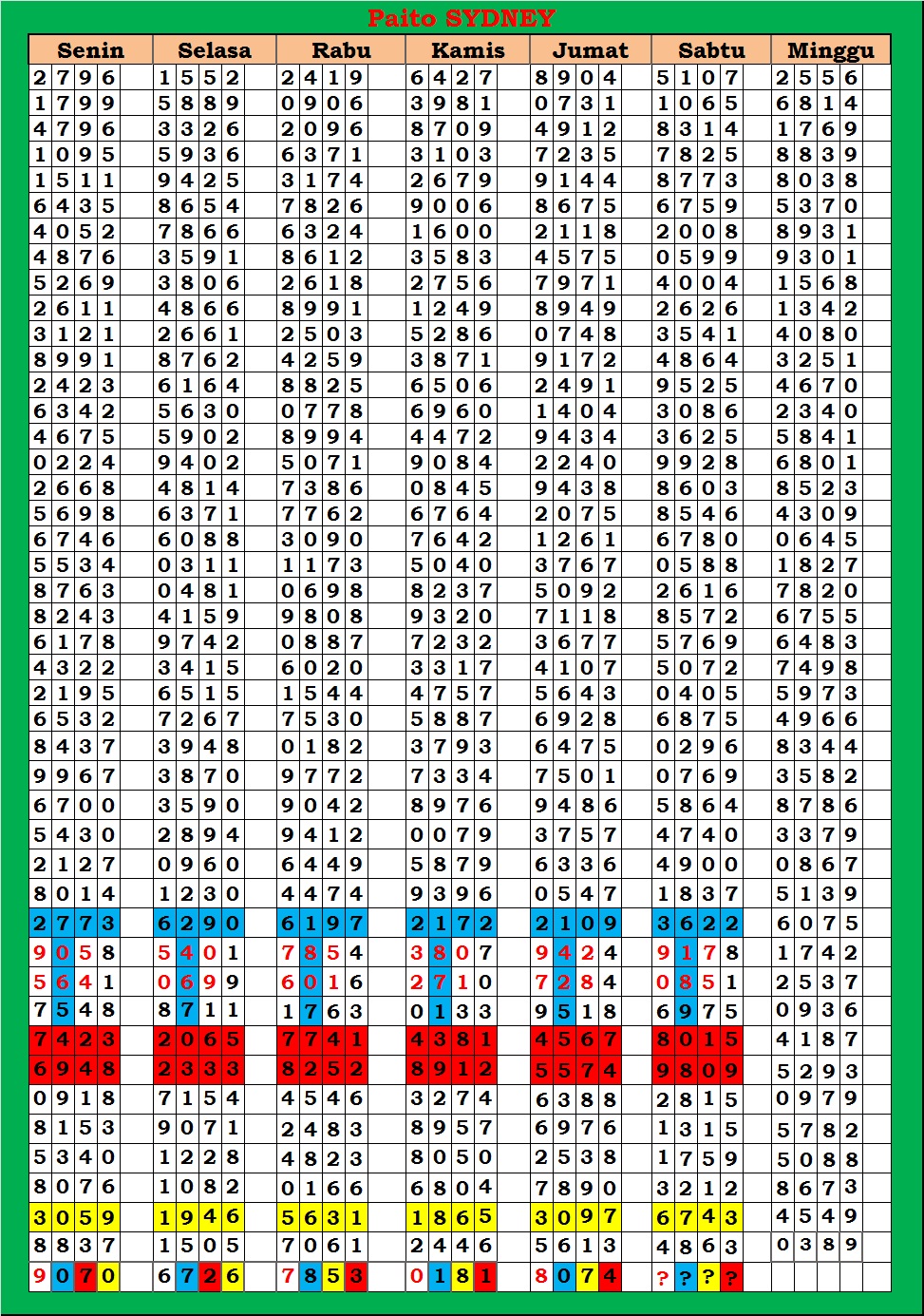 MASTER SYDNEY Jumat, 03-10-2025 Merupakan Prediksi Otomatis yang menggabungkan Metode Kalender Togel Dengan Rumus-rumus kontrol yang sudah terbukti keakuratanya.Gunakan Aplikasi Rekap untuk mendapatkan LN TOP. Harap Maklum Jika kadang meleset MASTER SYDNEY kita. Jadikan ini sebagai perbandingan saja dan tetap UPS