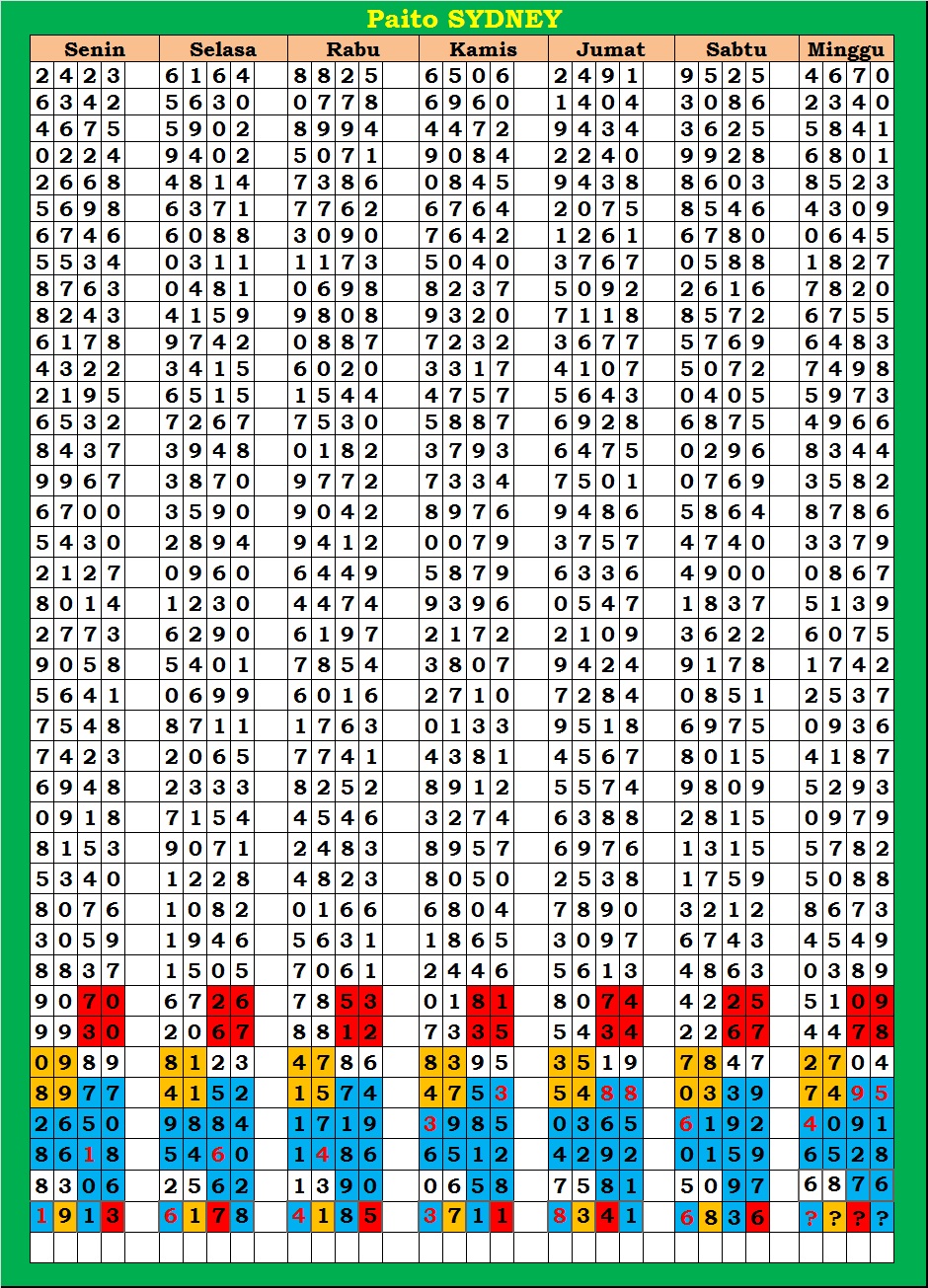 MASTER SYDNEY Jumat, 03-10-2025 Merupakan Prediksi Otomatis yang menggabungkan Metode Kalender Togel Dengan Rumus-rumus kontrol yang sudah terbukti keakuratanya.Gunakan Aplikasi Rekap untuk mendapatkan LN TOP. Harap Maklum Jika kadang meleset MASTER SYDNEY kita. Jadikan ini sebagai perbandingan saja dan tetap UPS