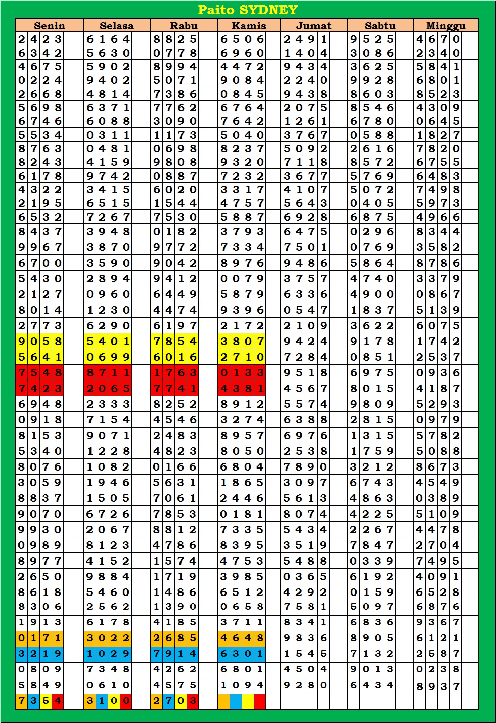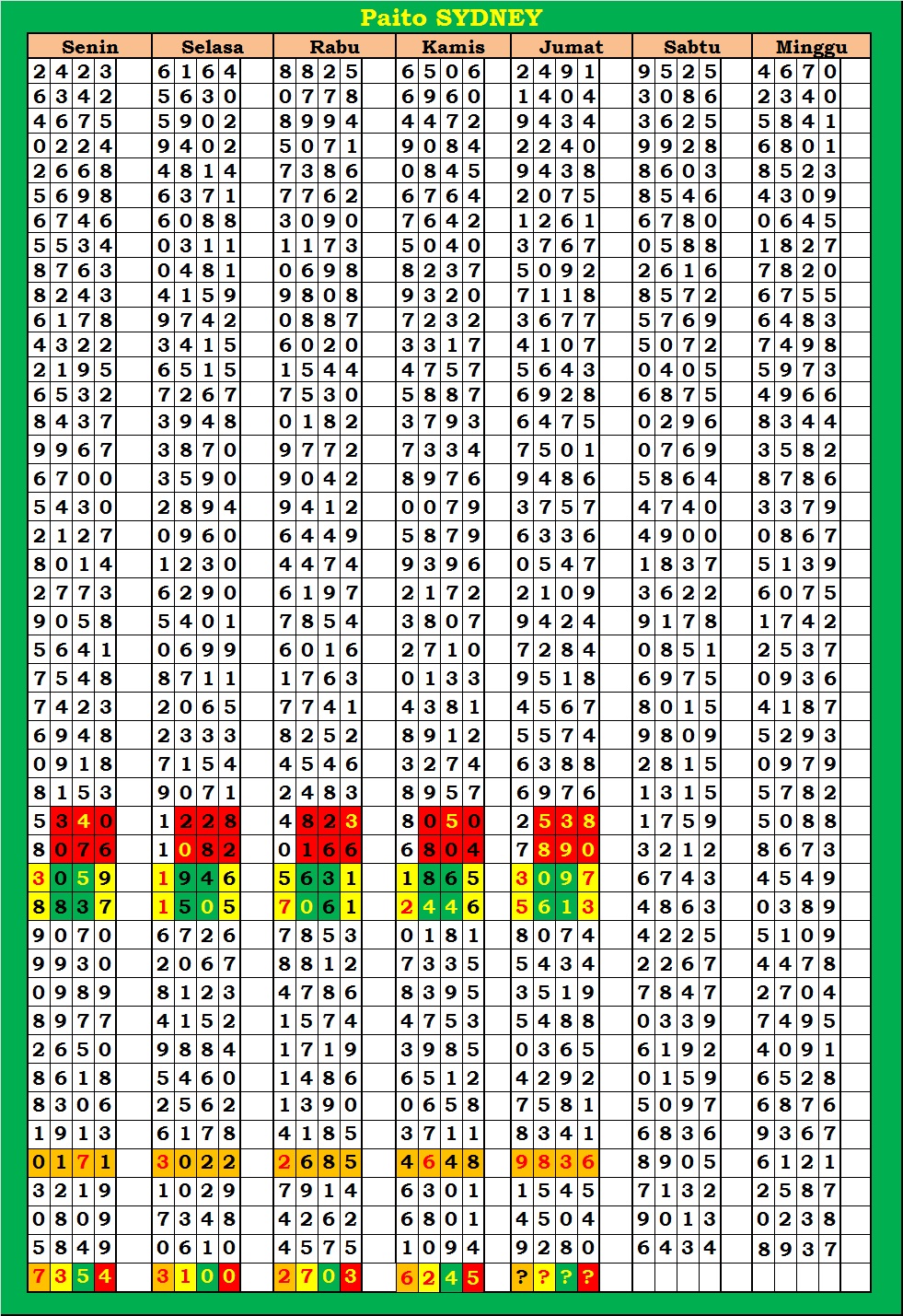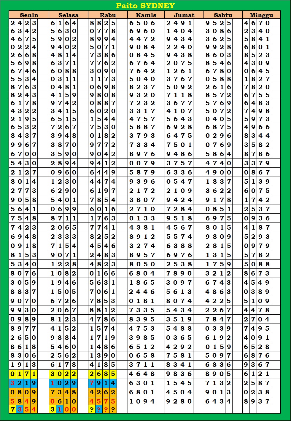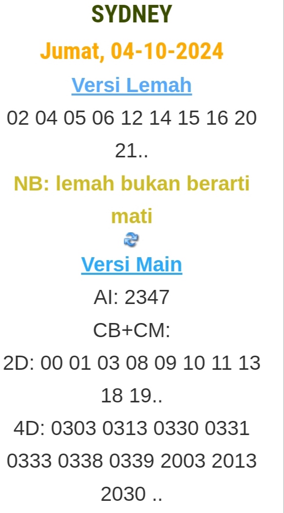 MASTER SYDNEY Jumat, 03-10-2025 Merupakan Prediksi Otomatis yang menggabungkan Metode Kalender Togel Dengan Rumus-rumus kontrol yang sudah terbukti keakuratanya.Gunakan Aplikasi Rekap untuk mendapatkan LN TOP. Harap Maklum Jika kadang meleset MASTER SYDNEY kita. Jadikan ini sebagai perbandingan saja dan tetap UPS
