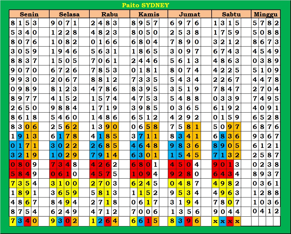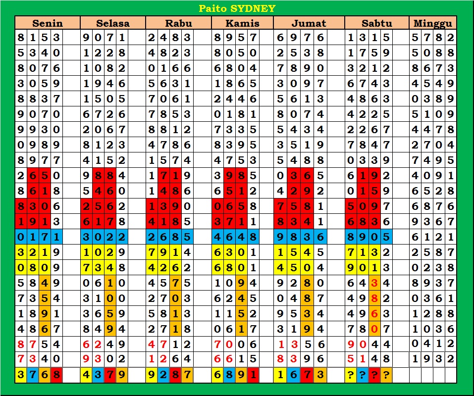 MASTER SYDNEY Jumat, 03-10-2025 Merupakan Prediksi Otomatis yang menggabungkan Metode Kalender Togel Dengan Rumus-rumus kontrol yang sudah terbukti keakuratanya.Gunakan Aplikasi Rekap untuk mendapatkan LN TOP. Harap Maklum Jika kadang meleset MASTER SYDNEY kita. Jadikan ini sebagai perbandingan saja dan tetap UPS