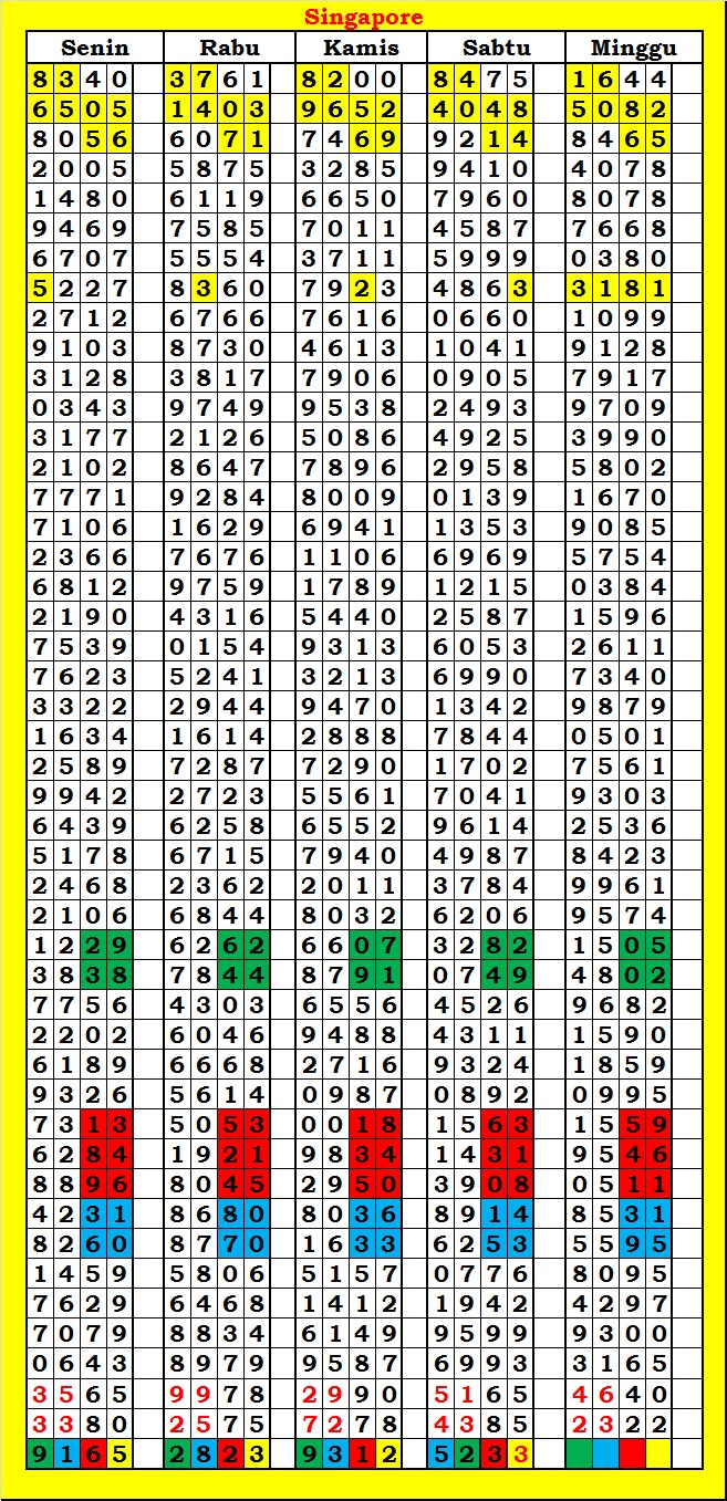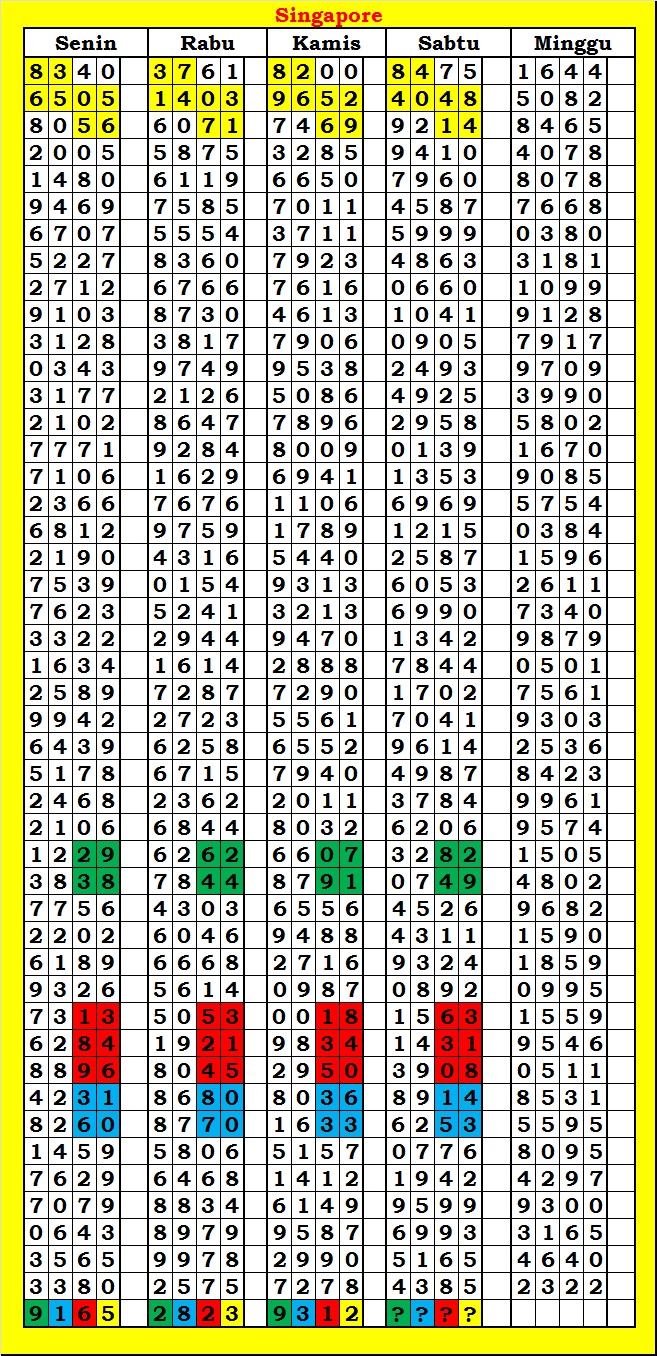 MASTER SINGAPURA Rabu, 08-10-2025 Merupakan Prediksi Otomatis yang menggabungkan Metode Kalender Togel Dengan Rumus-rumus kontrol yang sudah terbukti keakuratanya.Gunakan Aplikasi Rekap untuk mendapatkan LN TOP. Harap Maklum Jika kadang meleset MASTER SINGAPURA kita. Jadikan ini sebagai perbandingan saja dan tetap UPS