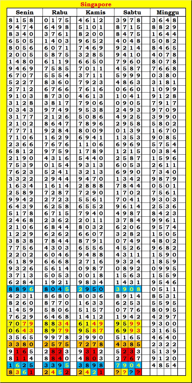 MASTER SINGAPURA Rabu, 08-10-2025 Merupakan Prediksi Otomatis yang menggabungkan Metode Kalender Togel Dengan Rumus-rumus kontrol yang sudah terbukti keakuratanya.Gunakan Aplikasi Rekap untuk mendapatkan LN TOP. Harap Maklum Jika kadang meleset MASTER SINGAPURA kita. Jadikan ini sebagai perbandingan saja dan tetap UPS