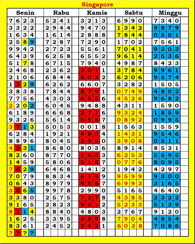 MASTER SINGAPURA Rabu, 08-10-2025 Merupakan Prediksi Otomatis yang menggabungkan Metode Kalender Togel Dengan Rumus-rumus kontrol yang sudah terbukti keakuratanya.Gunakan Aplikasi Rekap untuk mendapatkan LN TOP. Harap Maklum Jika kadang meleset MASTER SINGAPURA kita. Jadikan ini sebagai perbandingan saja dan tetap UPS