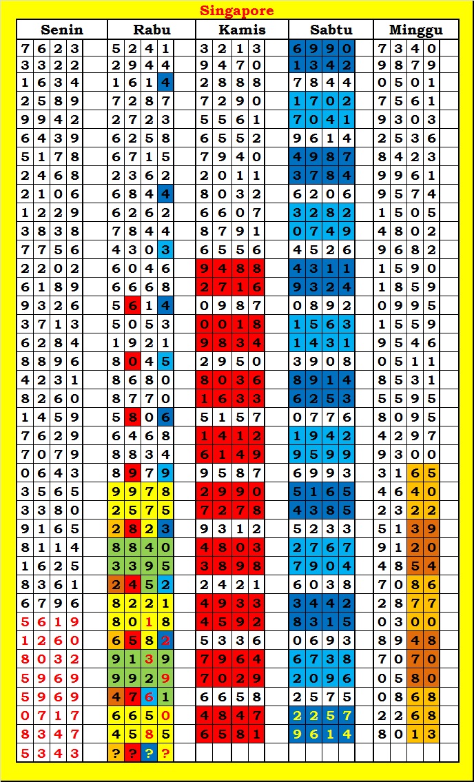 MASTER SINGAPURA Rabu, 08-10-2025 Merupakan Prediksi Otomatis yang menggabungkan Metode Kalender Togel Dengan Rumus-rumus kontrol yang sudah terbukti keakuratanya.Gunakan Aplikasi Rekap untuk mendapatkan LN TOP. Harap Maklum Jika kadang meleset MASTER SINGAPURA kita. Jadikan ini sebagai perbandingan saja dan tetap UPS