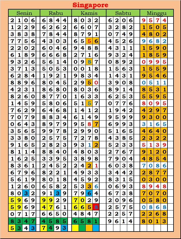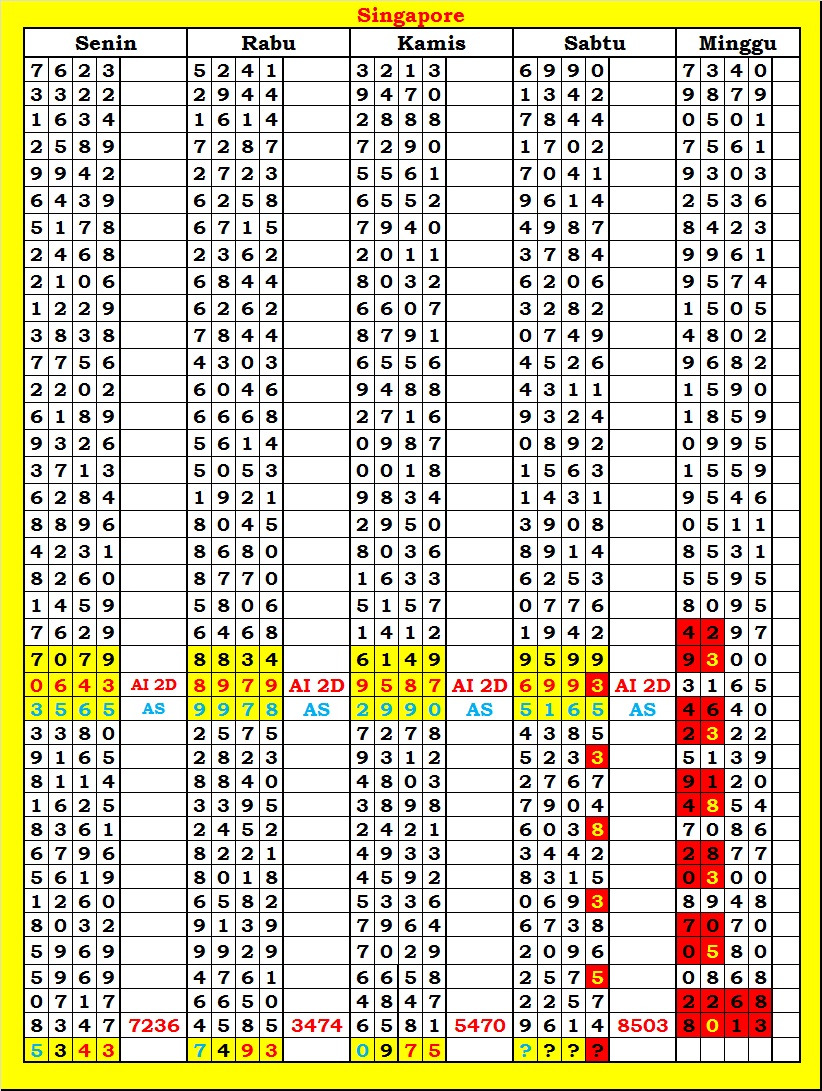 MASTER SINGAPURA Rabu, 08-10-2025 Merupakan Prediksi Otomatis yang menggabungkan Metode Kalender Togel Dengan Rumus-rumus kontrol yang sudah terbukti keakuratanya.Gunakan Aplikasi Rekap untuk mendapatkan LN TOP. Harap Maklum Jika kadang meleset MASTER SINGAPURA kita. Jadikan ini sebagai perbandingan saja dan tetap UPS