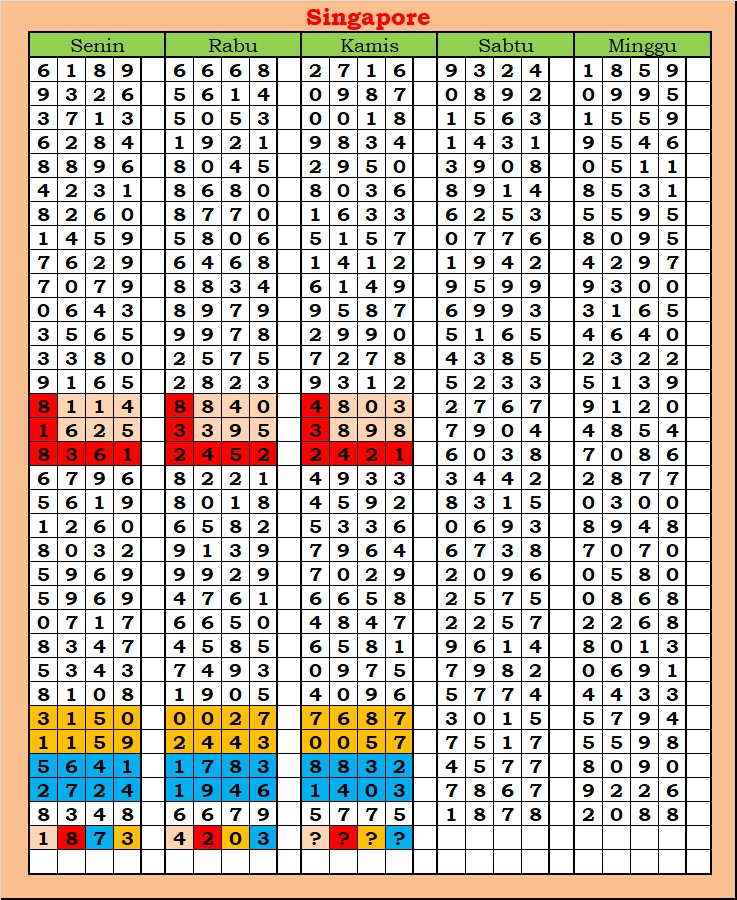 MASTER SINGAPURA Senin, 06-10-2025 Merupakan Prediksi Otomatis yang menggabungkan Metode Kalender Togel Dengan Rumus-rumus kontrol yang sudah terbukti keakuratanya.Gunakan Aplikasi Rekap untuk mendapatkan LN TOP. Harap Maklum Jika kadang meleset MASTER SINGAPURA kita. Jadikan ini sebagai perbandingan saja dan tetap UPS