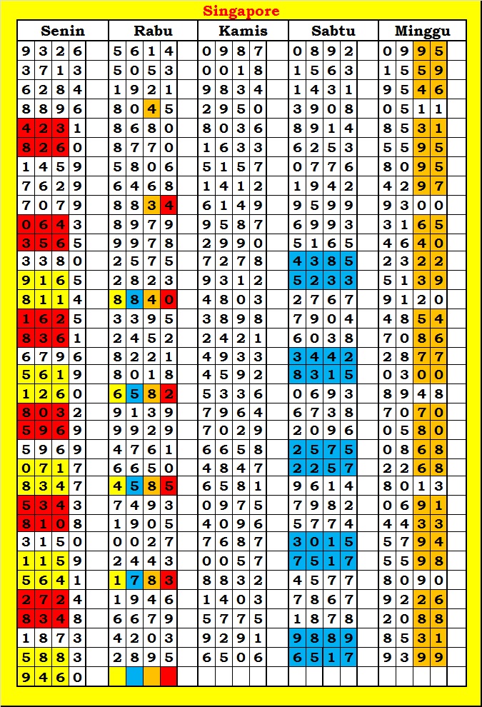 MASTER SINGAPURA Minggu, 05-10-2025 Merupakan Prediksi Otomatis yang menggabungkan Metode Kalender Togel Dengan Rumus-rumus kontrol yang sudah terbukti keakuratanya.Gunakan Aplikasi Rekap untuk mendapatkan LN TOP. Harap Maklum Jika kadang meleset MASTER SINGAPURA kita. Jadikan ini sebagai perbandingan saja dan tetap UPS
