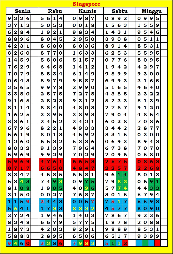 MASTER SINGAPURA Minggu, 05-10-2025 Merupakan Prediksi Otomatis yang menggabungkan Metode Kalender Togel Dengan Rumus-rumus kontrol yang sudah terbukti keakuratanya.Gunakan Aplikasi Rekap untuk mendapatkan LN TOP. Harap Maklum Jika kadang meleset MASTER SINGAPURA kita. Jadikan ini sebagai perbandingan saja dan tetap UPS