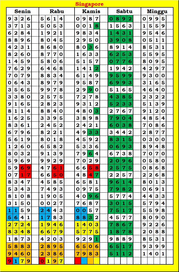 MASTER SINGAPURA Minggu, 05-10-2025 Merupakan Prediksi Otomatis yang menggabungkan Metode Kalender Togel Dengan Rumus-rumus kontrol yang sudah terbukti keakuratanya.Gunakan Aplikasi Rekap untuk mendapatkan LN TOP. Harap Maklum Jika kadang meleset MASTER SINGAPURA kita. Jadikan ini sebagai perbandingan saja dan tetap UPS