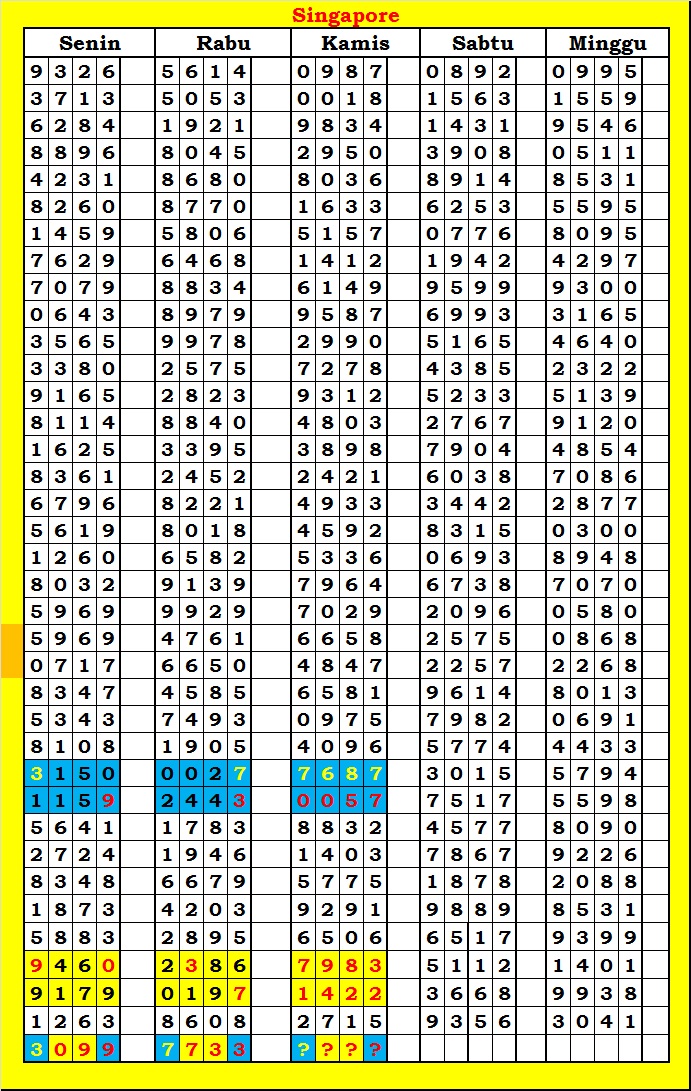 MASTER SINGAPURA Minggu, 05-10-2025 Merupakan Prediksi Otomatis yang menggabungkan Metode Kalender Togel Dengan Rumus-rumus kontrol yang sudah terbukti keakuratanya.Gunakan Aplikasi Rekap untuk mendapatkan LN TOP. Harap Maklum Jika kadang meleset MASTER SINGAPURA kita. Jadikan ini sebagai perbandingan saja dan tetap UPS