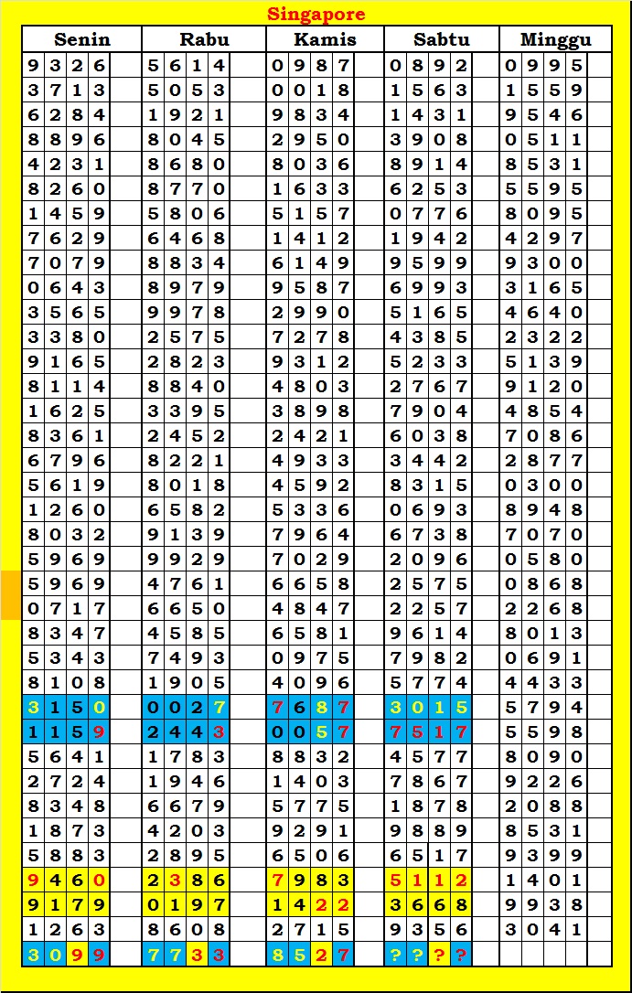 MASTER SINGAPURA Minggu, 05-10-2025 Merupakan Prediksi Otomatis yang menggabungkan Metode Kalender Togel Dengan Rumus-rumus kontrol yang sudah terbukti keakuratanya.Gunakan Aplikasi Rekap untuk mendapatkan LN TOP. Harap Maklum Jika kadang meleset MASTER SINGAPURA kita. Jadikan ini sebagai perbandingan saja dan tetap UPS