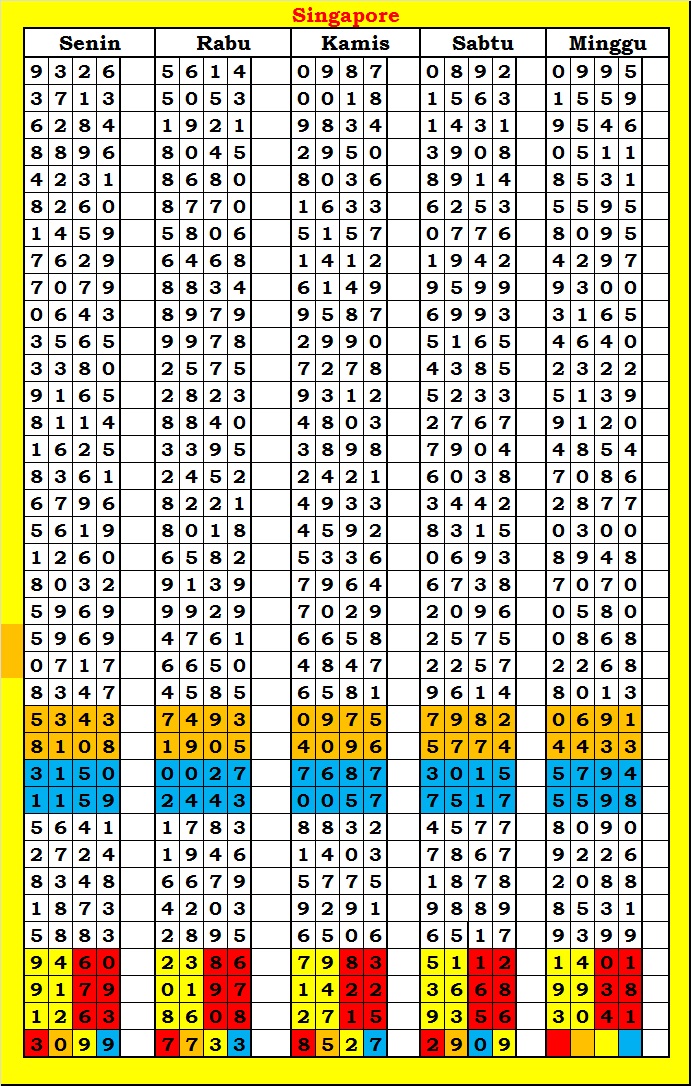 MASTER SINGAPURA Minggu, 05-10-2025 Merupakan Prediksi Otomatis yang menggabungkan Metode Kalender Togel Dengan Rumus-rumus kontrol yang sudah terbukti keakuratanya.Gunakan Aplikasi Rekap untuk mendapatkan LN TOP. Harap Maklum Jika kadang meleset MASTER SINGAPURA kita. Jadikan ini sebagai perbandingan saja dan tetap UPS