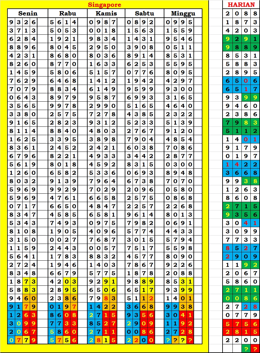 MASTER SINGAPURA Sabtu, 04-10-2025 Merupakan Prediksi Otomatis yang menggabungkan Metode Kalender Togel Dengan Rumus-rumus kontrol yang sudah terbukti keakuratanya.Gunakan Aplikasi Rekap untuk mendapatkan LN TOP. Harap Maklum Jika kadang meleset MASTER SINGAPURA kita. Jadikan ini sebagai perbandingan saja dan tetap UPS