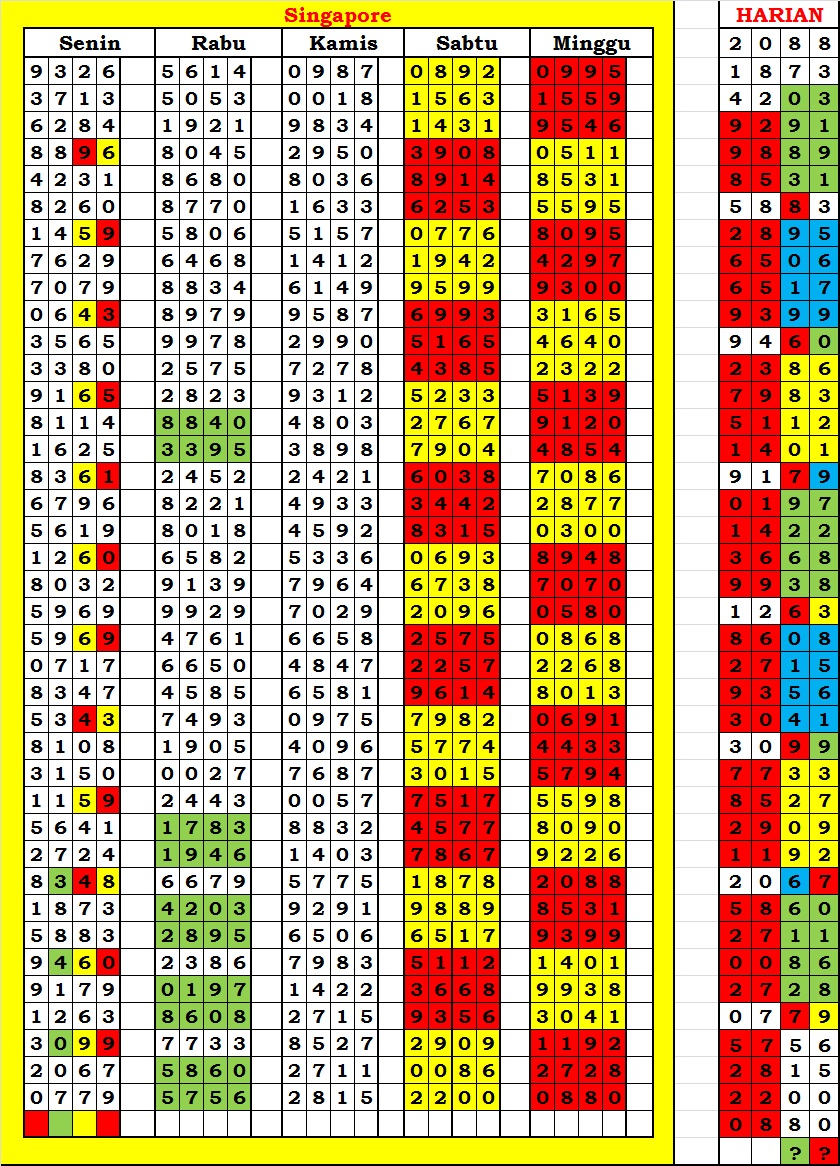 MASTER SINGAPURA Sabtu, 04-10-2025 Merupakan Prediksi Otomatis yang menggabungkan Metode Kalender Togel Dengan Rumus-rumus kontrol yang sudah terbukti keakuratanya.Gunakan Aplikasi Rekap untuk mendapatkan LN TOP. Harap Maklum Jika kadang meleset MASTER SINGAPURA kita. Jadikan ini sebagai perbandingan saja dan tetap UPS