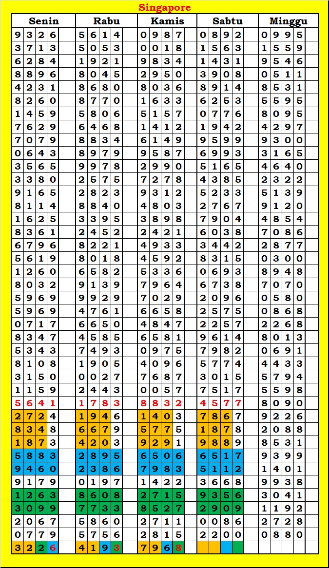 MASTER SINGAPURA Sabtu, 04-10-2025 Merupakan Prediksi Otomatis yang menggabungkan Metode Kalender Togel Dengan Rumus-rumus kontrol yang sudah terbukti keakuratanya.Gunakan Aplikasi Rekap untuk mendapatkan LN TOP. Harap Maklum Jika kadang meleset MASTER SINGAPURA kita. Jadikan ini sebagai perbandingan saja dan tetap UPS