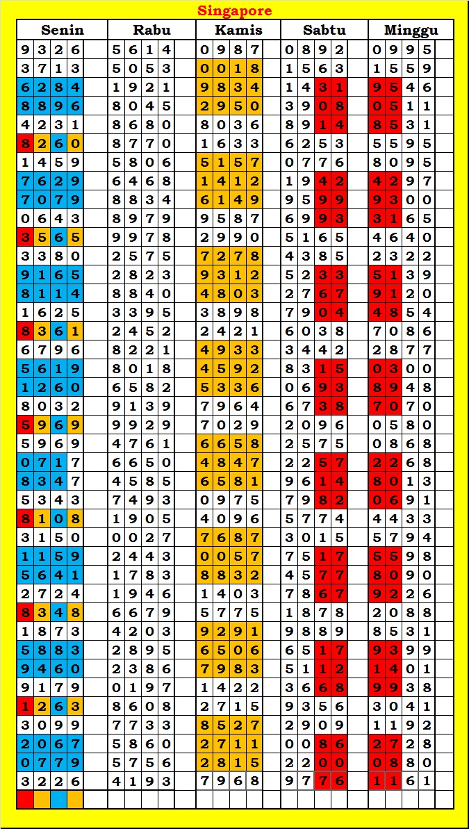 MASTER SINGAPURA Sabtu, 04-10-2025 Merupakan Prediksi Otomatis yang menggabungkan Metode Kalender Togel Dengan Rumus-rumus kontrol yang sudah terbukti keakuratanya.Gunakan Aplikasi Rekap untuk mendapatkan LN TOP. Harap Maklum Jika kadang meleset MASTER SINGAPURA kita. Jadikan ini sebagai perbandingan saja dan tetap UPS