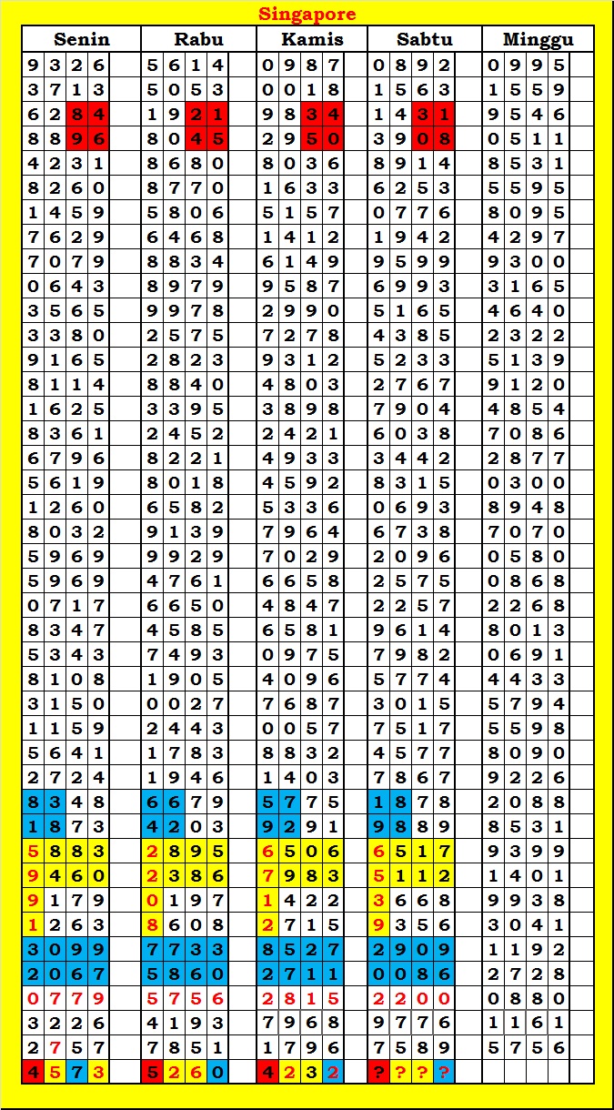 MASTER SINGAPURA Sabtu, 04-10-2025 Merupakan Prediksi Otomatis yang menggabungkan Metode Kalender Togel Dengan Rumus-rumus kontrol yang sudah terbukti keakuratanya.Gunakan Aplikasi Rekap untuk mendapatkan LN TOP. Harap Maklum Jika kadang meleset MASTER SINGAPURA kita. Jadikan ini sebagai perbandingan saja dan tetap UPS