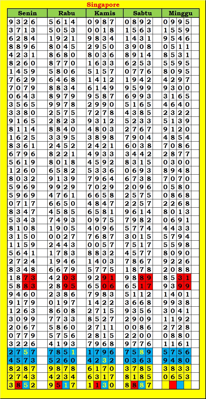 MASTER SINGAPURA Sabtu, 04-10-2025 Merupakan Prediksi Otomatis yang menggabungkan Metode Kalender Togel Dengan Rumus-rumus kontrol yang sudah terbukti keakuratanya.Gunakan Aplikasi Rekap untuk mendapatkan LN TOP. Harap Maklum Jika kadang meleset MASTER SINGAPURA kita. Jadikan ini sebagai perbandingan saja dan tetap UPS