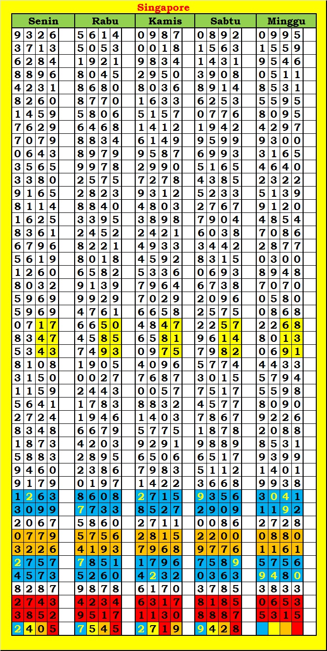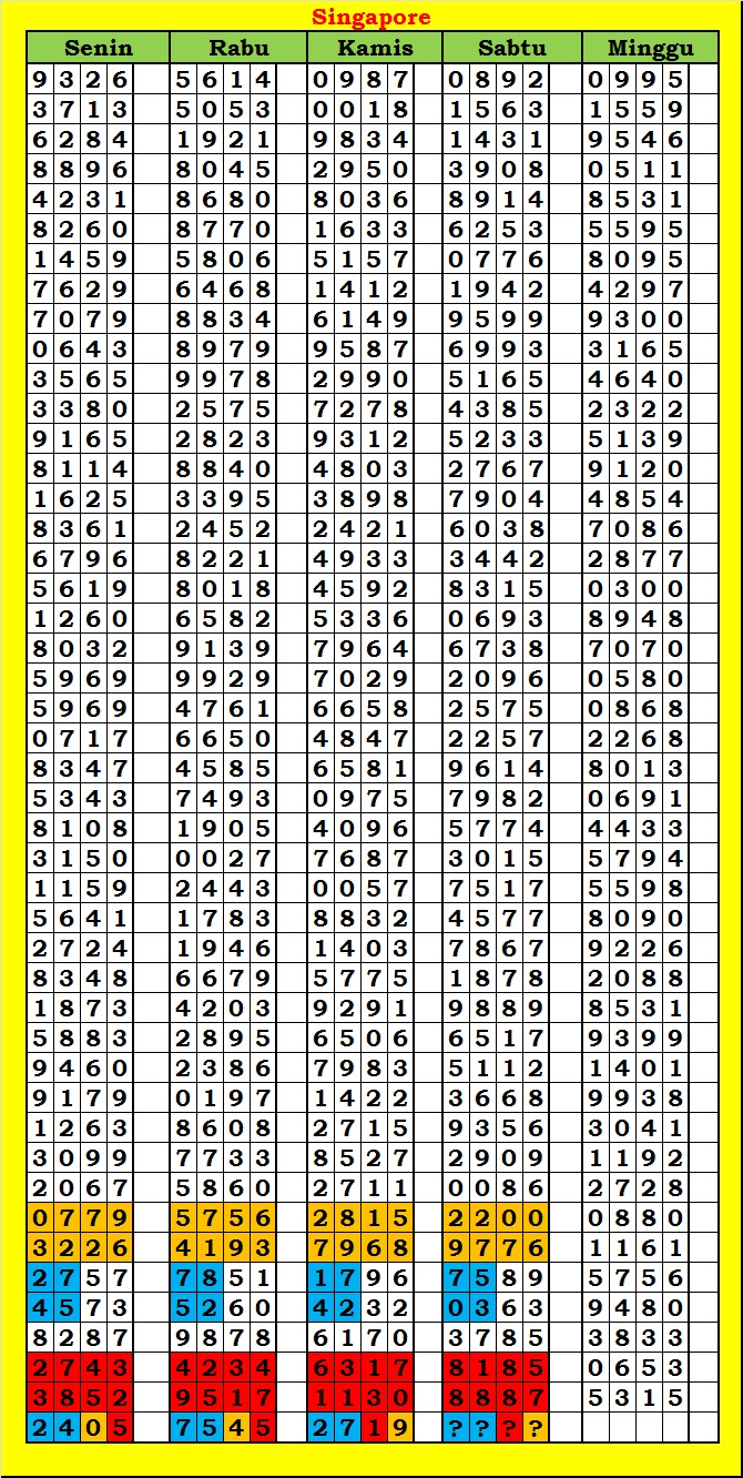 MASTER SINGAPURA Sabtu, 04-10-2025 Merupakan Prediksi Otomatis yang menggabungkan Metode Kalender Togel Dengan Rumus-rumus kontrol yang sudah terbukti keakuratanya.Gunakan Aplikasi Rekap untuk mendapatkan LN TOP. Harap Maklum Jika kadang meleset MASTER SINGAPURA kita. Jadikan ini sebagai perbandingan saja dan tetap UPS