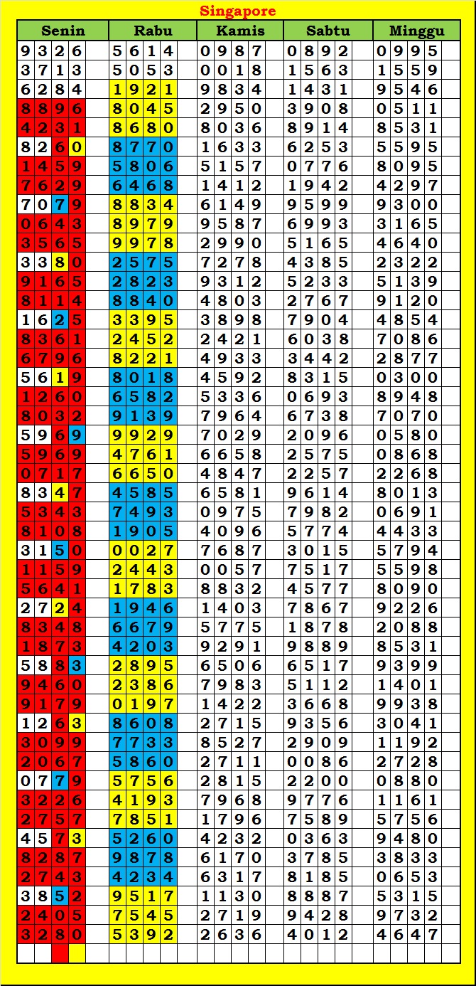MASTER SINGAPURA Sabtu, 04-10-2025 Merupakan Prediksi Otomatis yang menggabungkan Metode Kalender Togel Dengan Rumus-rumus kontrol yang sudah terbukti keakuratanya.Gunakan Aplikasi Rekap untuk mendapatkan LN TOP. Harap Maklum Jika kadang meleset MASTER SINGAPURA kita. Jadikan ini sebagai perbandingan saja dan tetap UPS