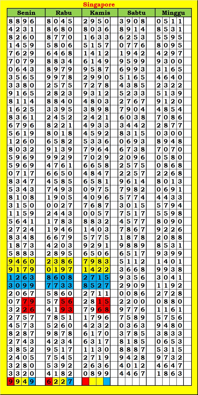 MASTER SINGAPURA Sabtu, 04-10-2025 Merupakan Prediksi Otomatis yang menggabungkan Metode Kalender Togel Dengan Rumus-rumus kontrol yang sudah terbukti keakuratanya.Gunakan Aplikasi Rekap untuk mendapatkan LN TOP. Harap Maklum Jika kadang meleset MASTER SINGAPURA kita. Jadikan ini sebagai perbandingan saja dan tetap UPS