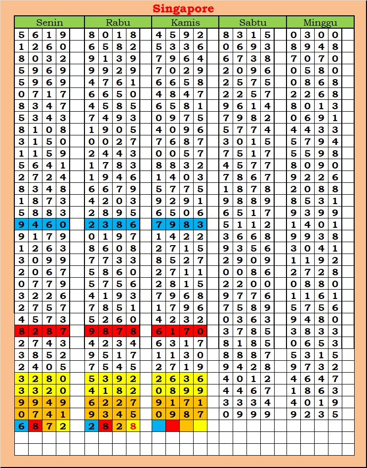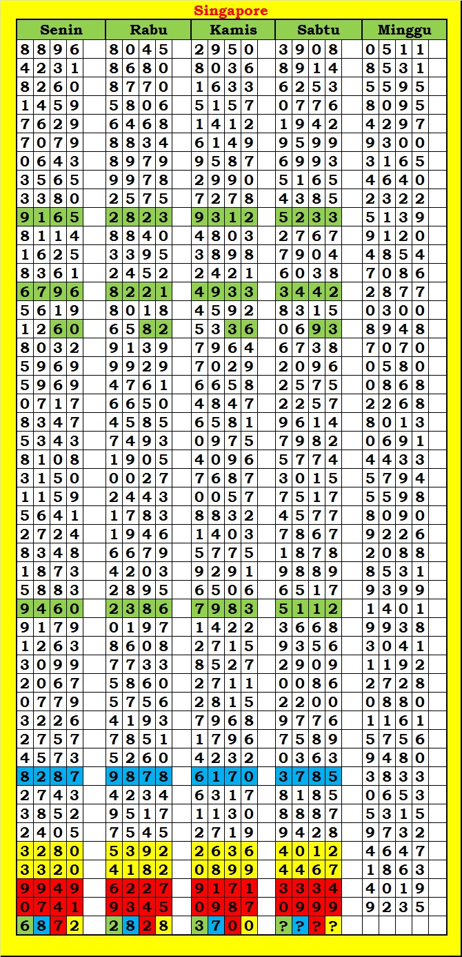 MASTER SINGAPURA Sabtu, 04-10-2025 Merupakan Prediksi Otomatis yang menggabungkan Metode Kalender Togel Dengan Rumus-rumus kontrol yang sudah terbukti keakuratanya.Gunakan Aplikasi Rekap untuk mendapatkan LN TOP. Harap Maklum Jika kadang meleset MASTER SINGAPURA kita. Jadikan ini sebagai perbandingan saja dan tetap UPS